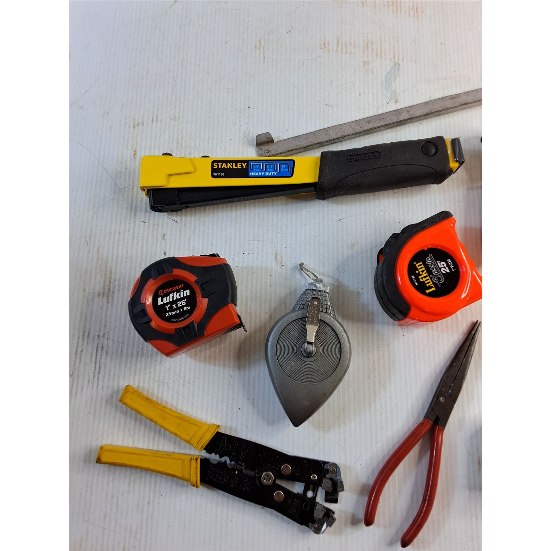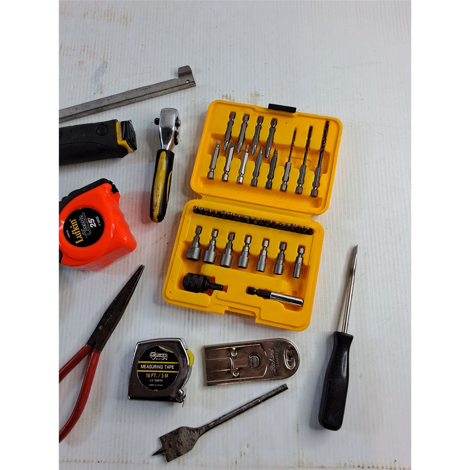 Drill Bit Set, Measuring Tapes, Roofing Stapler, Ratchet Wrench, Chalk Line and Misc