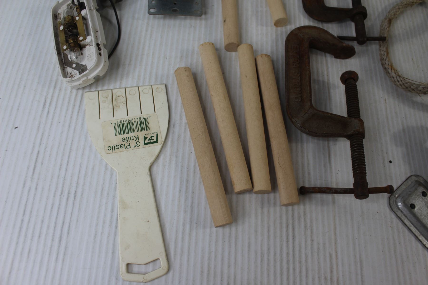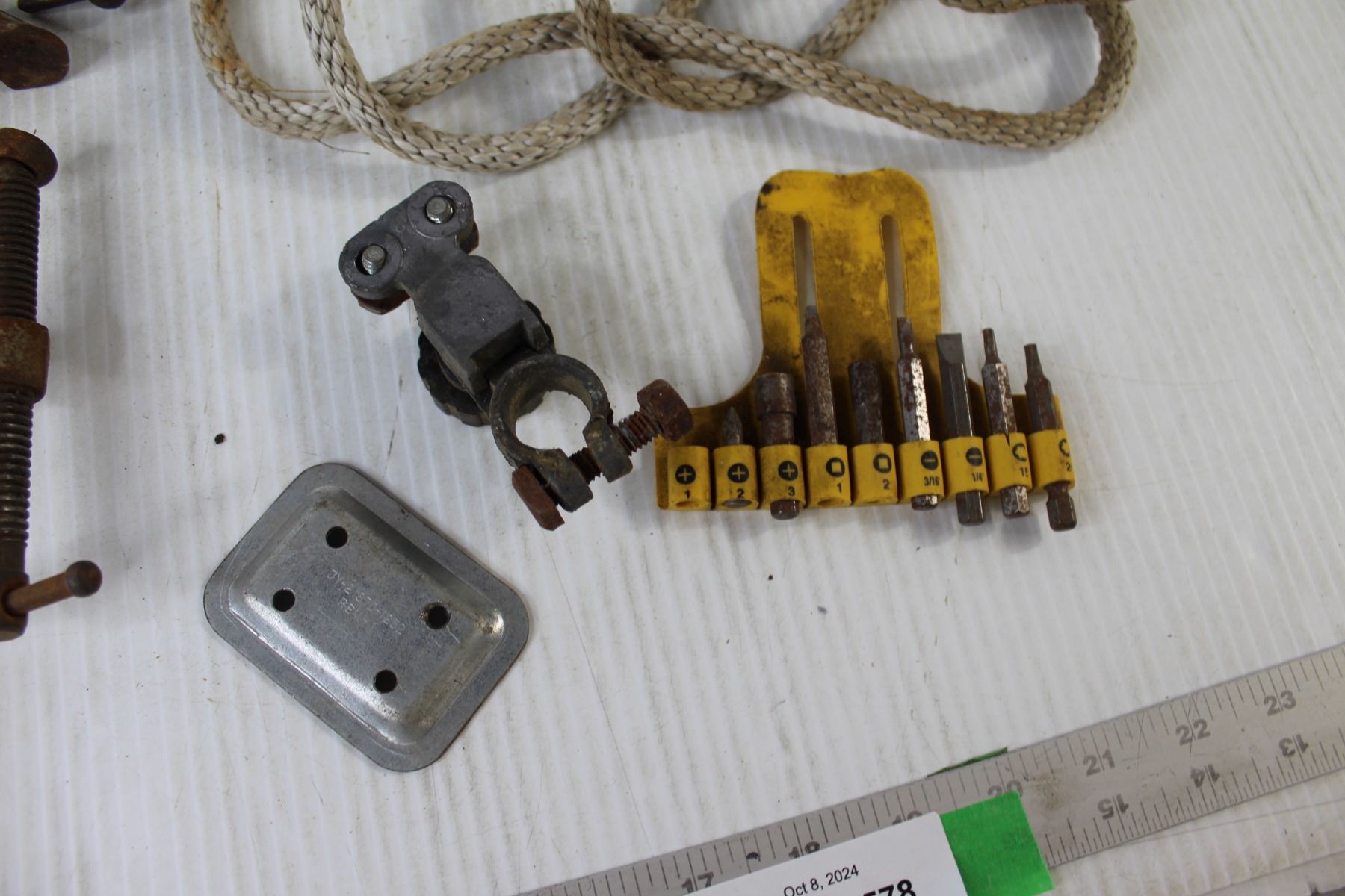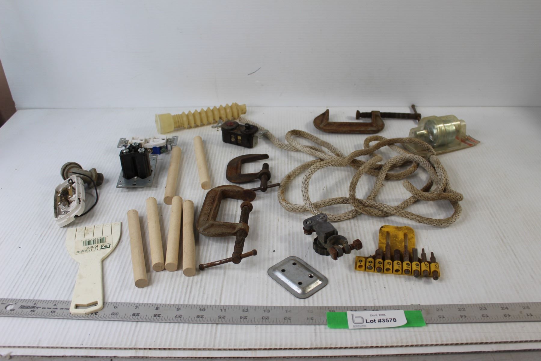 Drill Bits, (3) C Clamps, Rope, Assorted Electrical/Household Items