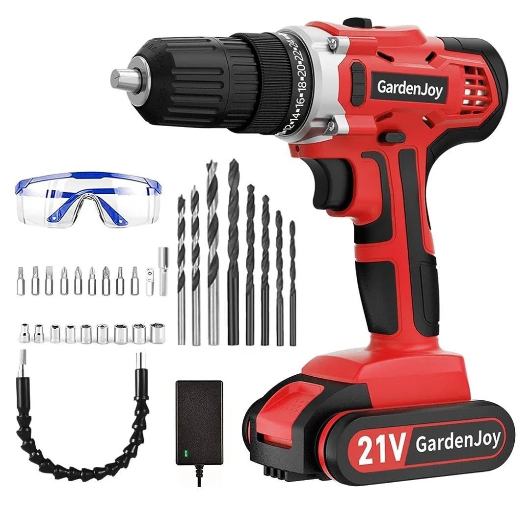 21V power drill with various bits and safety glasses, includes battery and charger, new.