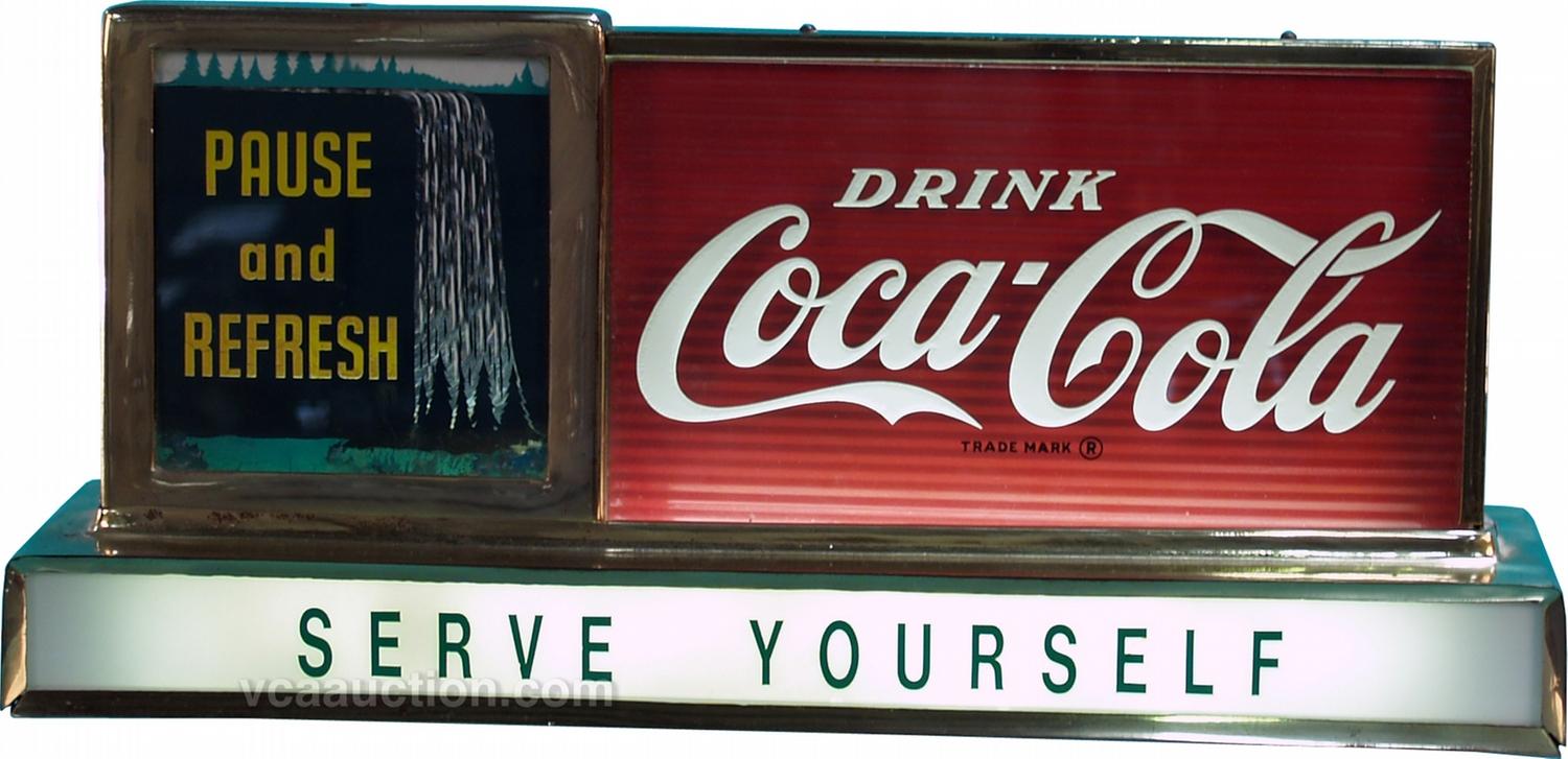 Drink Coca Cola Countertop Metal & Glass Light-Up Sign w/ running waterfall "Pause & Refresh - Serve Yourself", works, in great condition - 19" x 9"