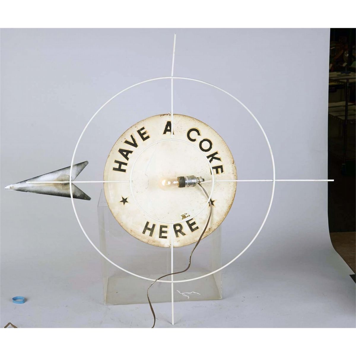 16" disc sign with "compass" mount and "chrome" arrow circa 1950s. Reads "Have A Coke Here" on reverse side. Condition (Excellent). Size 35" x 39"