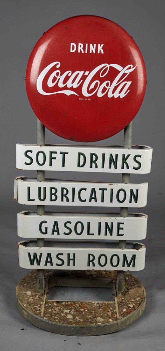 With 24" porcelain disc and 8 privilege panels (2 "Wash Room", 2 "Soft Drinks", 2 "Gasoline" & 2 "Lubrication") circa 1950s. Condition (Good). Size 30" x 62"
