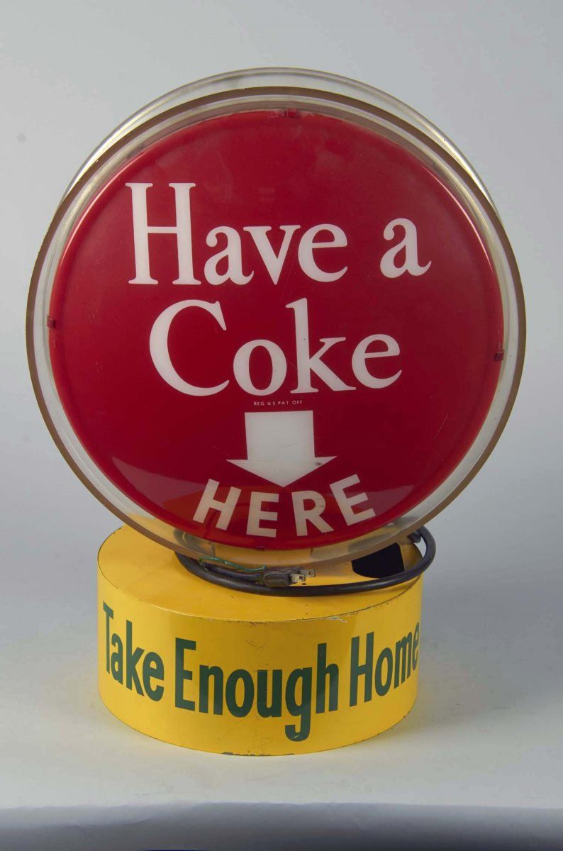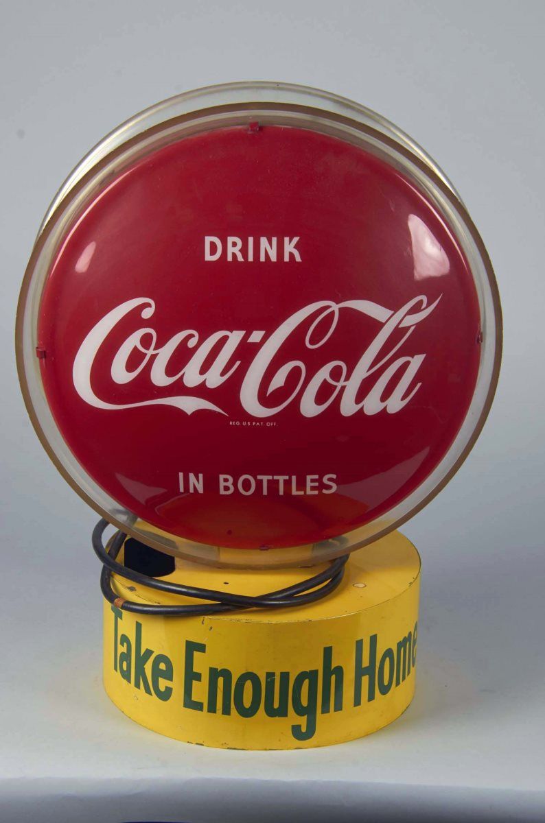 Plastic and metal double sided Coke disc sign with Drink Coca Cola in Bottles / Have A Coke Here slogan and Take Enough Home on metal base circa 1950's. Works. Condition (Excellent). Size 16" x 21" x 11"