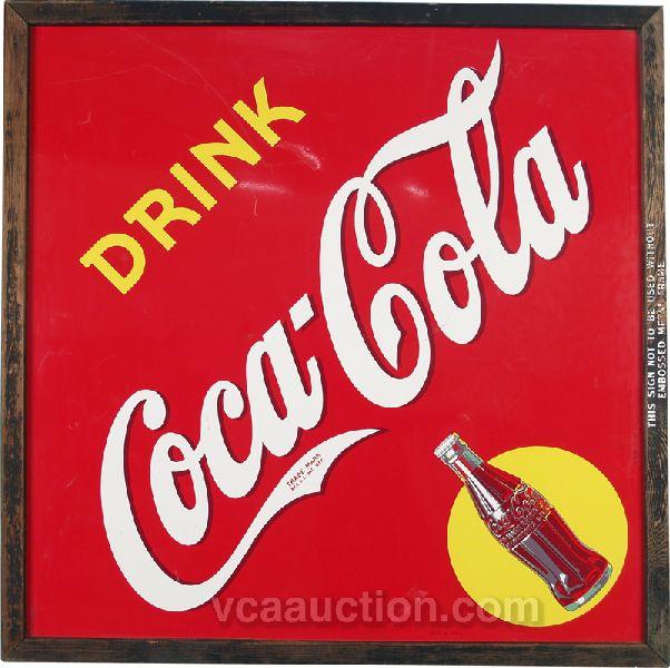 Drink Coca Cola Tin Sign In Wood Frame. On frame "This sign not to be used w/out embossed metal frame - 46" x 46"