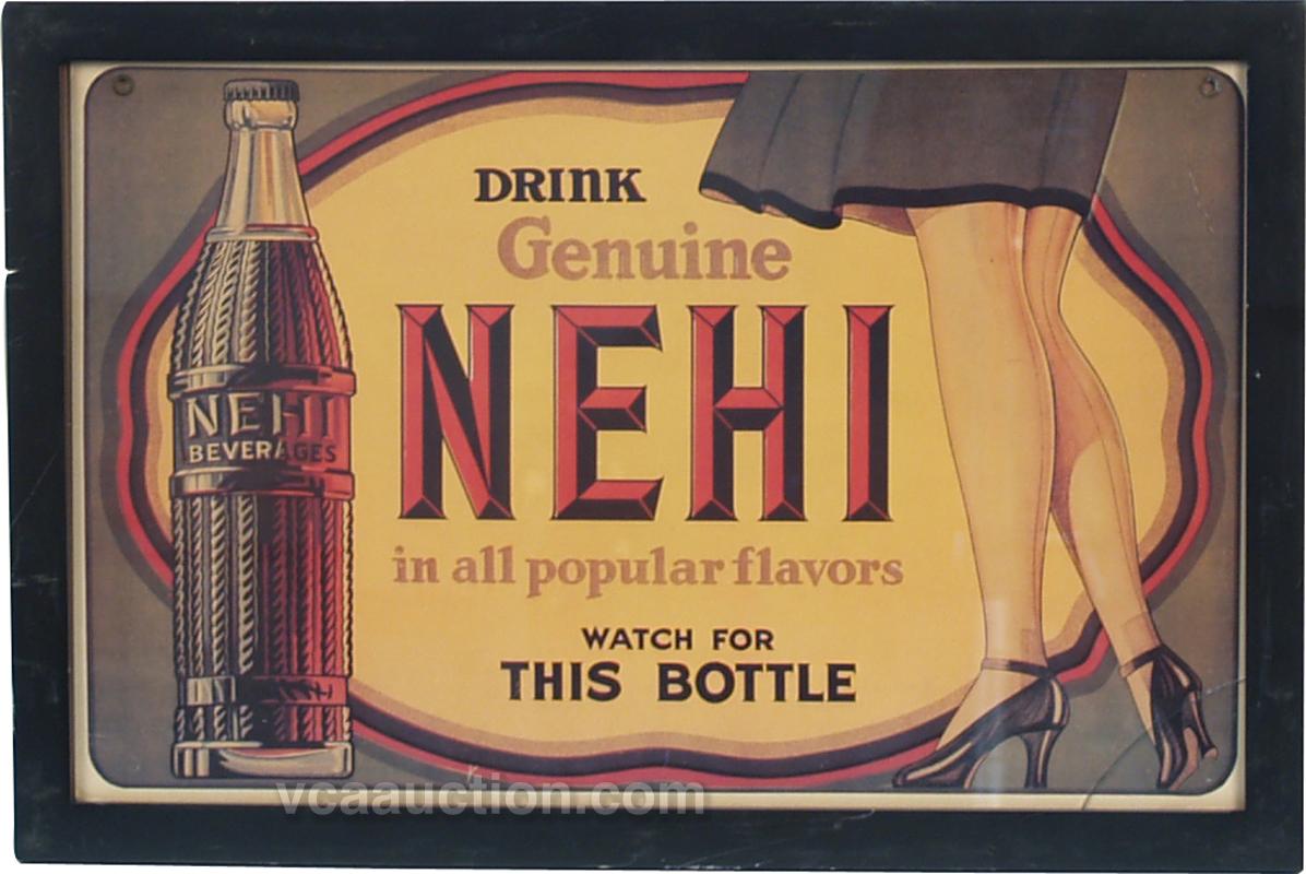 "Drink Genuine NEHI" Cardboard Sign "In All Popular Flavors - Watch For This Bottle" in frame - 18" x 12"