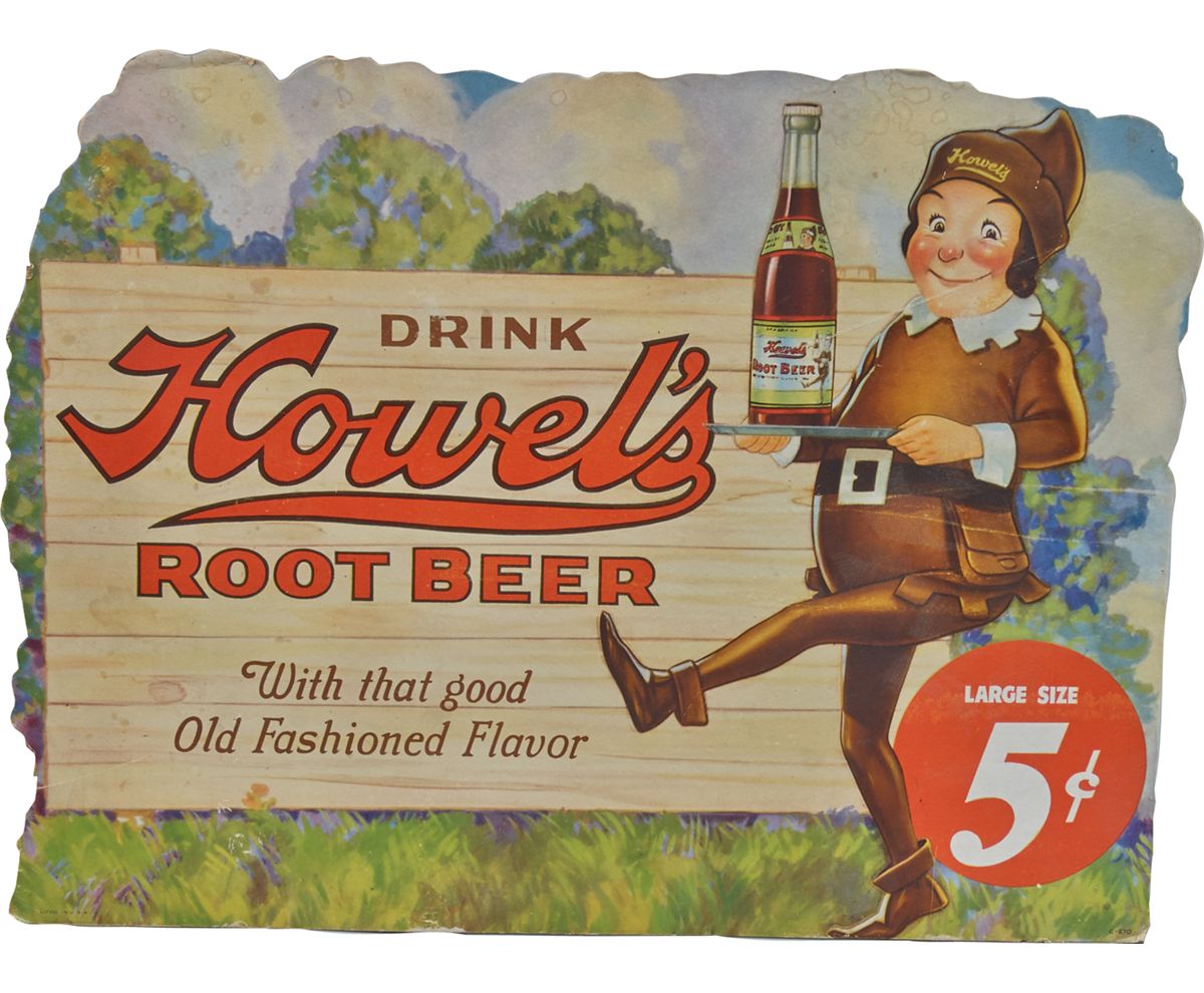 Drink Howel's Root Beer Easel-Back Cardboard Advertisement Display Sign, "With That Good Old Fashioned Flavor" featuring elf, Nice - 18" x 14"