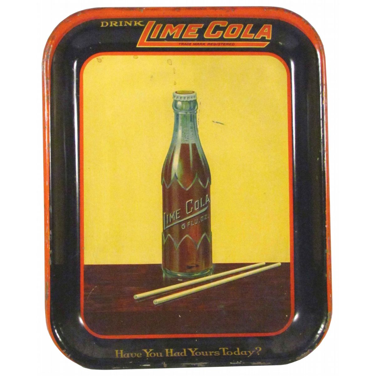 Drink Lime Cola Tin Serving Tray. Scratch in center, some staining and edge ware otherwise good condition. 10 1/2 X 13 1/4 inches.