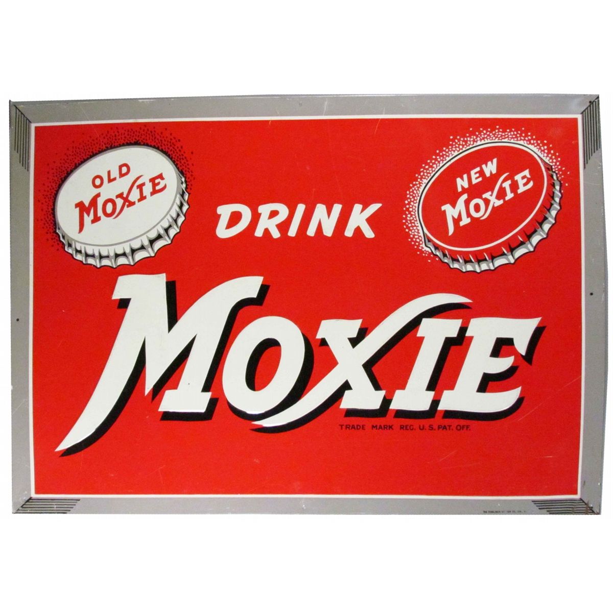 Drink Moxie Embossed Self Framed Tin Sign. The Donaldson Art Sign Co. Surface scratches and creases at bottom right otherwise very good condition. 27 X 19 1/2 inches.