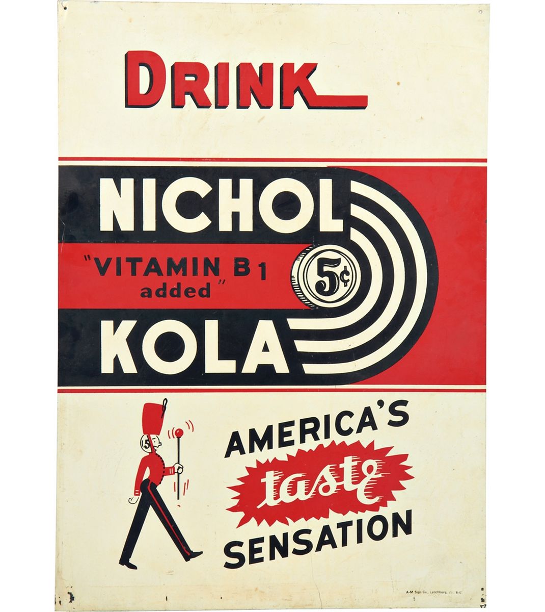 Drink Nichol Kola 5 Cents Tin Sign, "Vitamin B1 Added - America's Taste Sensation" - 20"w x 28"h