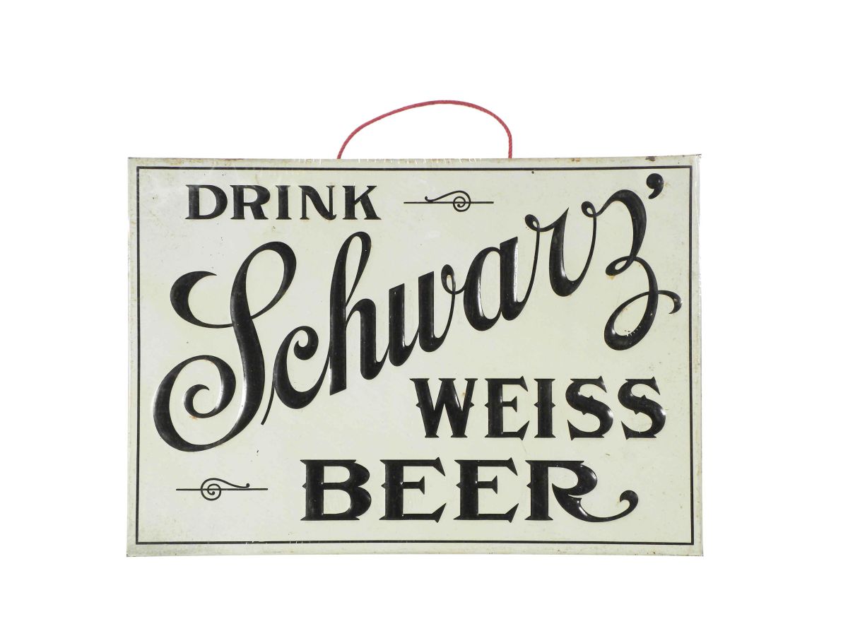 Drink Schwarz Weiss Beer Embossed Tin String Hanger Sign. Some minor rust around the edges otherwise very good condition. 9 1/4 X 6 1/2 inches.