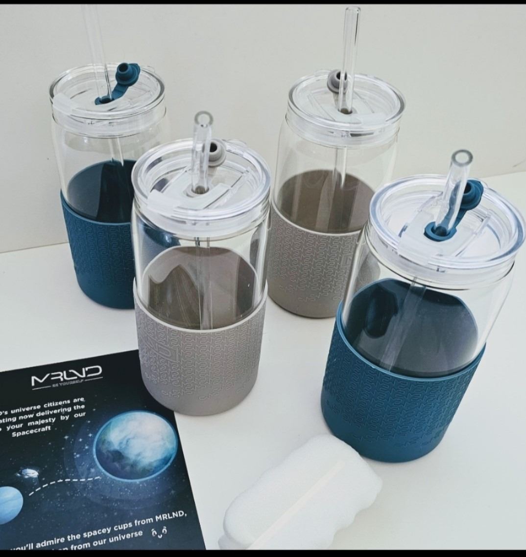 Mrlnd 4Pc Set 17oz Glass Drinking Cups, Lids, Glass Straws, And Cleaning Accessories Are Included, Brand New