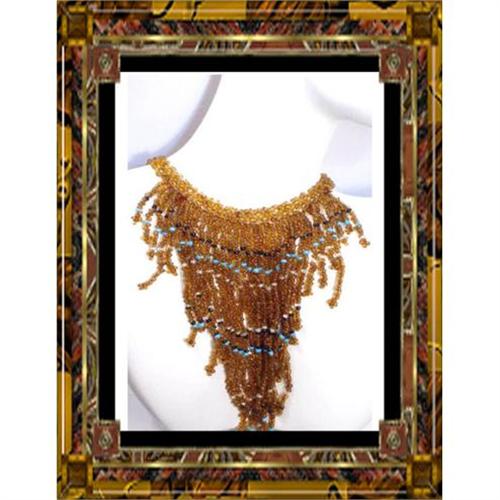 Golden glass beads with a hint of turquoise color make up this exotic fancy necklace. The band that goes around your neck is 12" of glass beads which then goes into an additional 6" of chain. The longest drop is 5" and the bib width is 4 ¾". It is in great shape and has nice weight to it so it hangs well.
