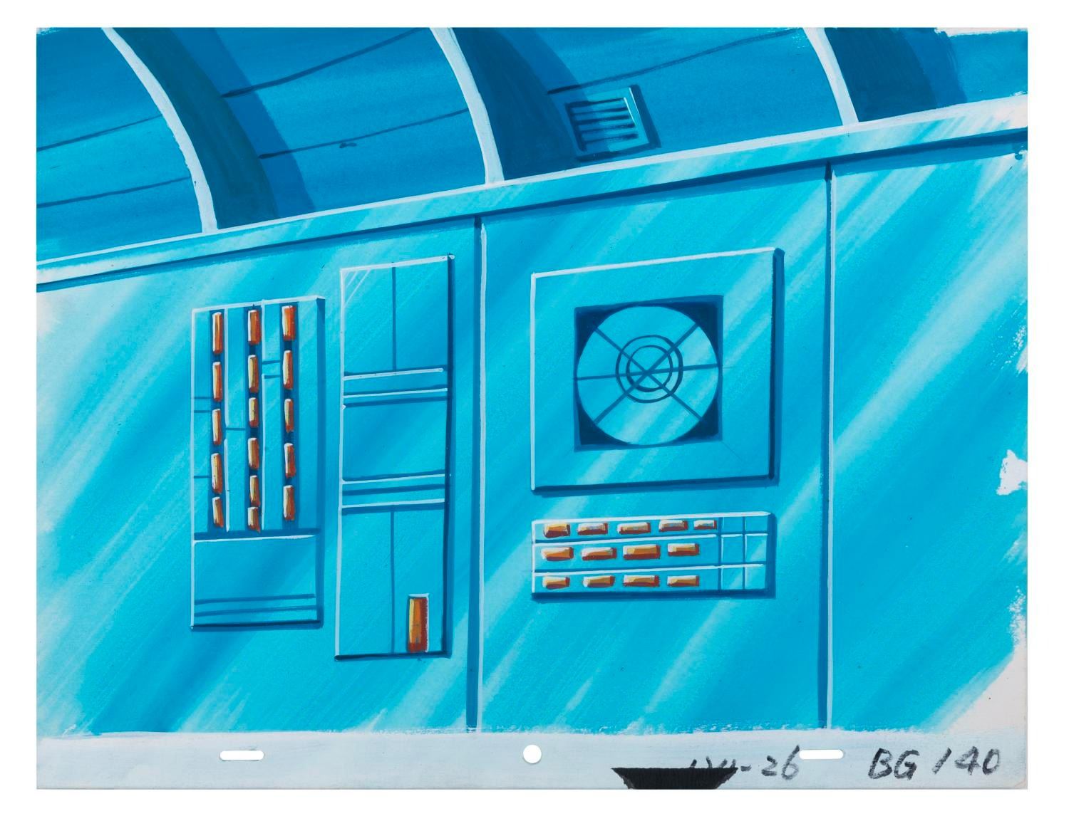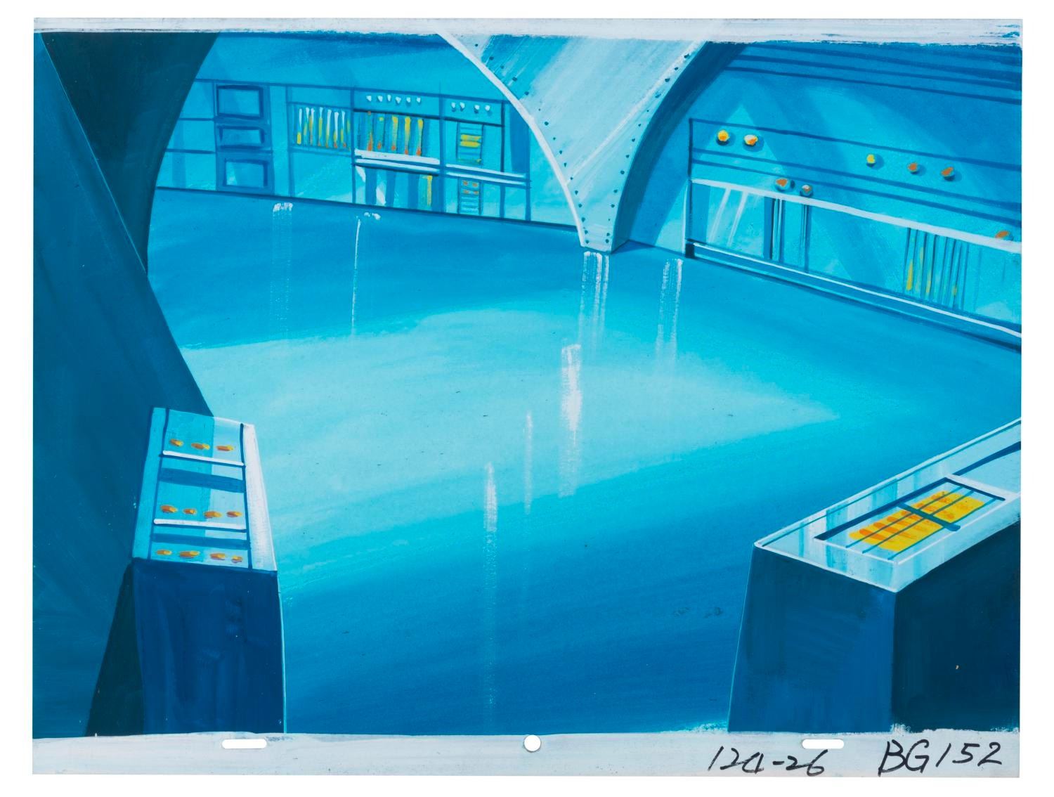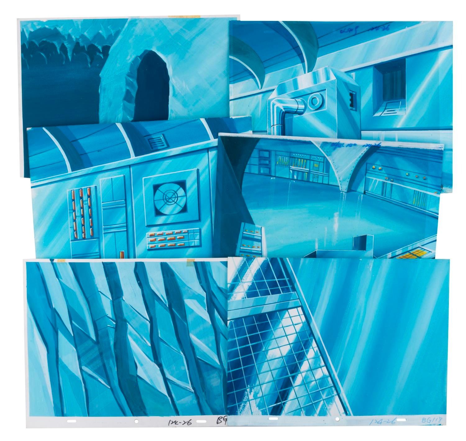 (Lucasfilm/Nelvana, 1985) A collection of six original background paintings from the “Droids” animated series, including two overlay scene cels. Each measuring 10.5” x 13.75”, the backgrounds accomplished in gouache and cels display in very good condition, with typical wear from production use and age.