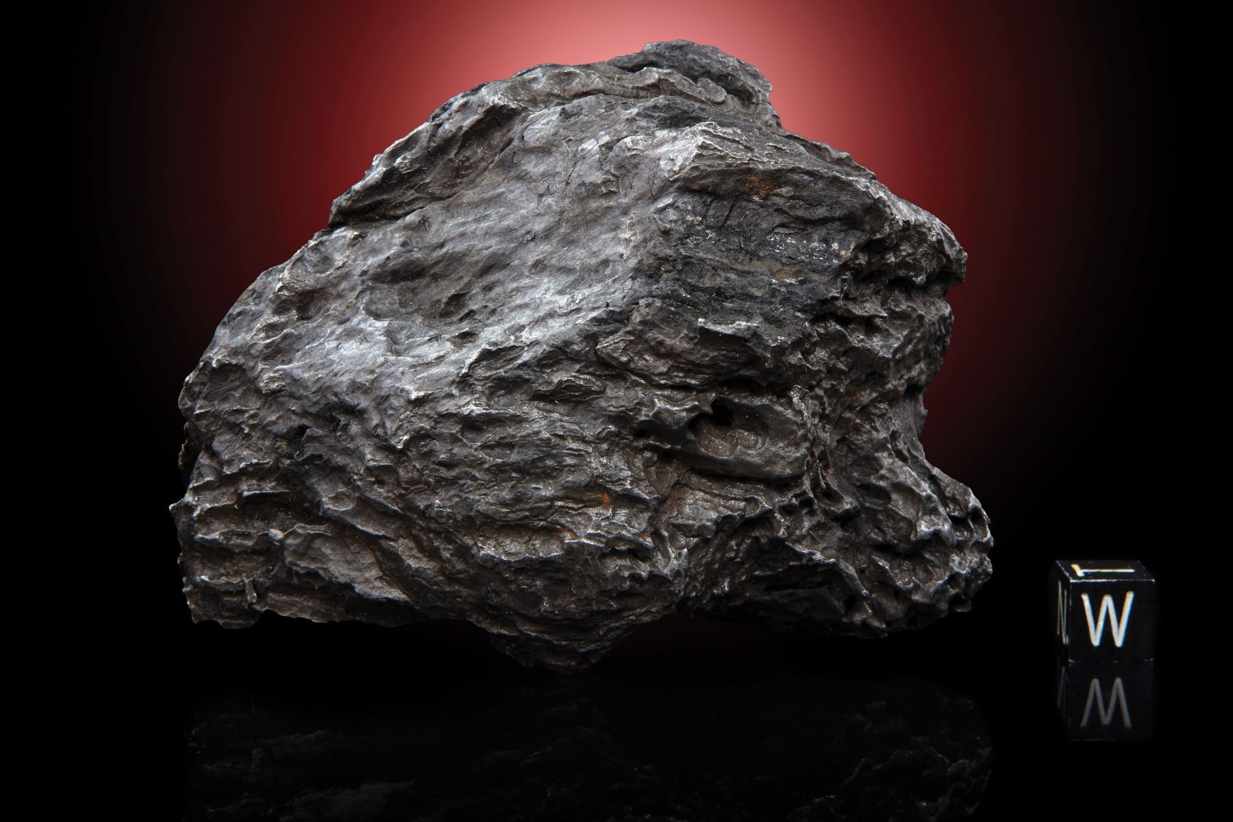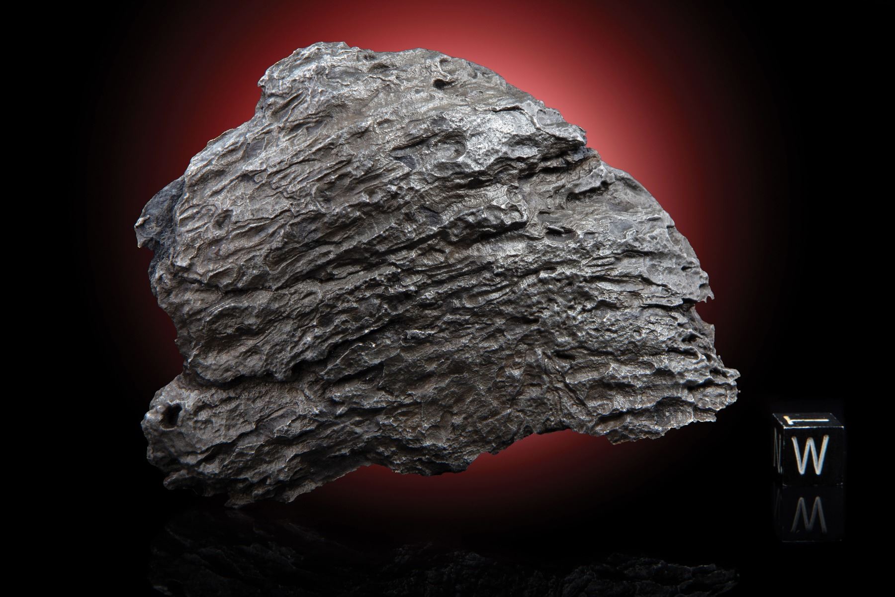 Iron meteorite, ungrouped ataxite Ryazan, near Kasimov, found 2000. Sculptural fragment weighing 587 grams and measuring 98 mm x 70 mm x 38 mm. This angular, sculptural fragment, perhaps reminiscent of a bear’s head or a warrior’s helmet, is covered on both sides by curving striations that could have been formed upon impact or by terrestrial weathering, or both. These angular, shard-like characteristics are somewhat reminiscent of Sikhote-Alin shrapnel [SEE LOT 2462] associated with the Siberian crater field. This perhaps lends credence to the theory that Dronino was a crater-forming event, though clear evidence of any such crater remains to be found, and the idea has not been officially accepted by academia.