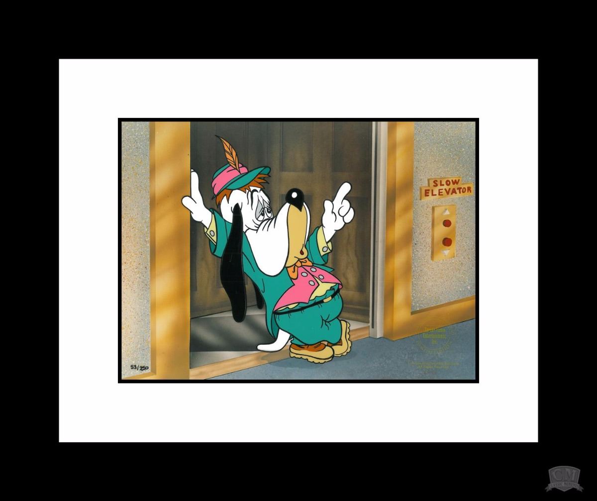 This limited edition hand-painted 12-field cel released in 1991 features Droopy outside the "slow" elevator. Edition Size 250. Turner Seal and COA. Faded signature by Droopy animator Marcia Fertig. Framed 15x18