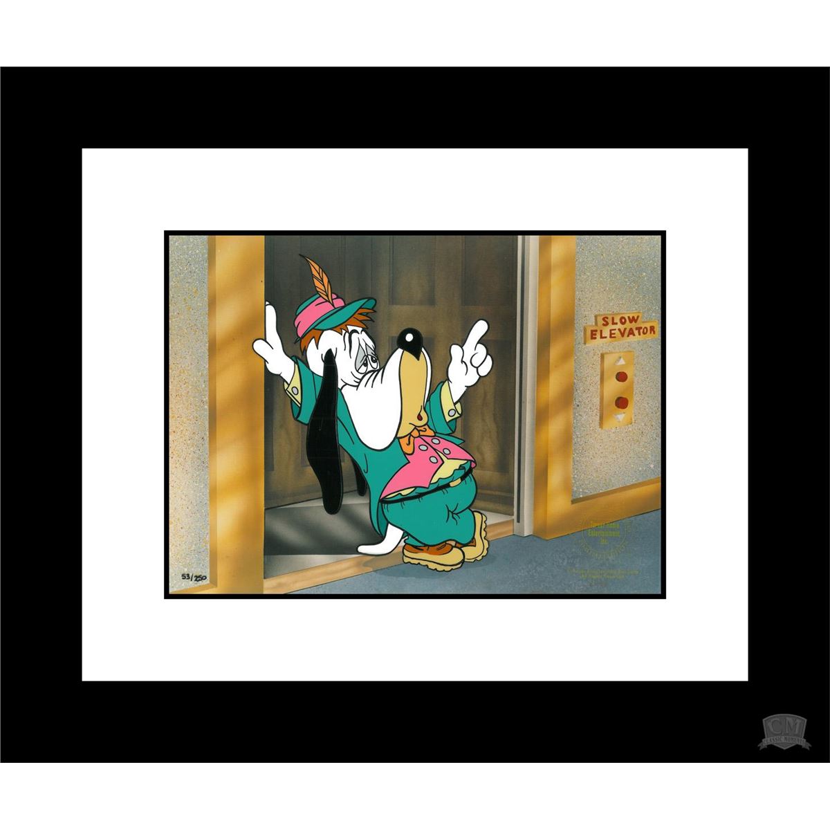 This limited edition hand-painted 12-field cel released in 1991 features Droopy outside the "slow" elevator. Edition Size 250. Turner Seal and COA. Faded signature by Droopy animator Marcia Fertig. Framed 15x18