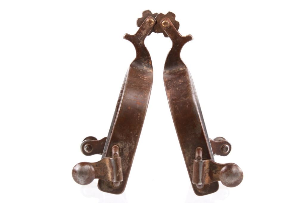 Featured in this lot is this pair of drop boot western cowboy spurs, circa 1960's. The spurs feature solidly and professionally crafted western spur pair with a drop boot shank and a rowel with five clover tines on the spoke. The condition of this pair of spurs is good, with a slight patina adorning this pair of spurs consistent with age and use. The measurements of this pair of spurs are 1 1/2" x 4" x 5 1/4".