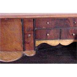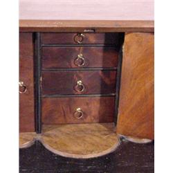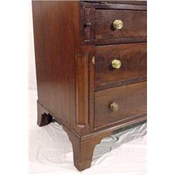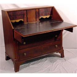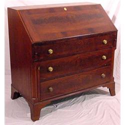 Federal mahogany drop front desk, Ca. 1790; constructed of cherry and crotch mahogany veneer over pine; featuring matched grain mahogany front and splay leg bracket base; the case is cherry; interior is fitted with 11 drawers and a door; it is also accented with Birdseye panels; brass pulls with pressed flower decoration are probably original; glue blocks on base are mostly intact; crack on bracket molding of right rear leg; joint separation on left side; good old finish; 42" wide x 41.75" tall x 23.5" deep.