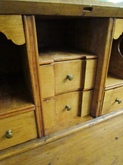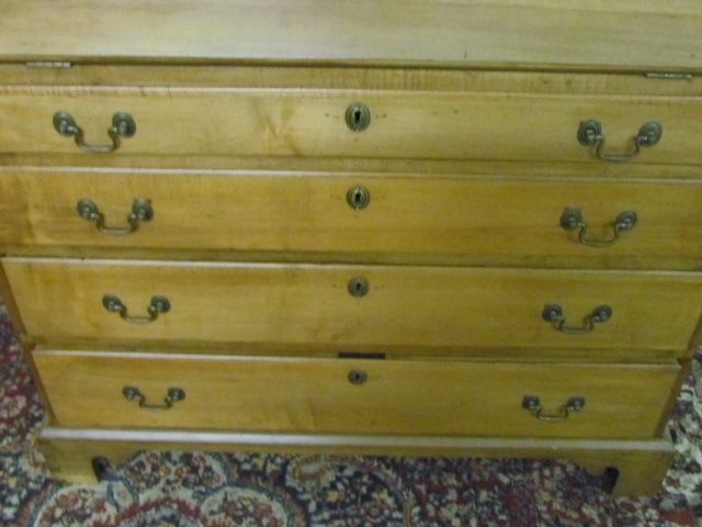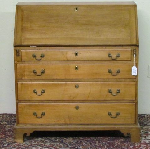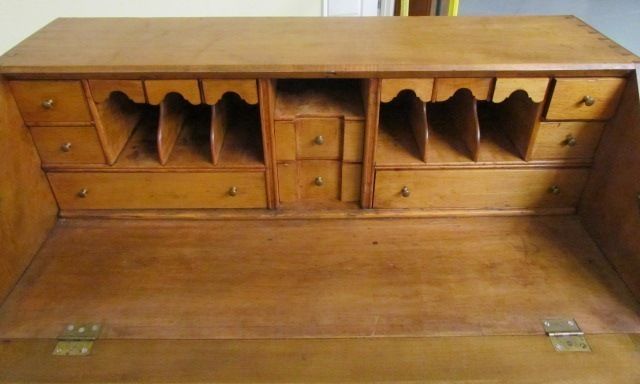 Period New Hampshire Drop Front Writing Desk, dovetailed construction, including top board. Graduated 4 drawer front with original interior and finish 40" tx 36" w x 18"d