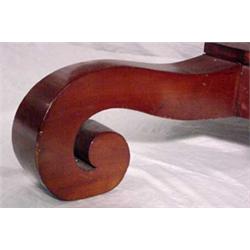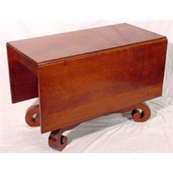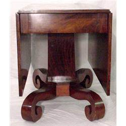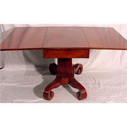 Empire drop leaf dining table, Ca. 1845; constructed with a solid cherry top; set upon a figural mahogany veneer over pine base; the square column is supported by 4 rolled feet; old finish; minor scratches and abrasions; 22.5" closed (61" fully open) x 29.5" tall