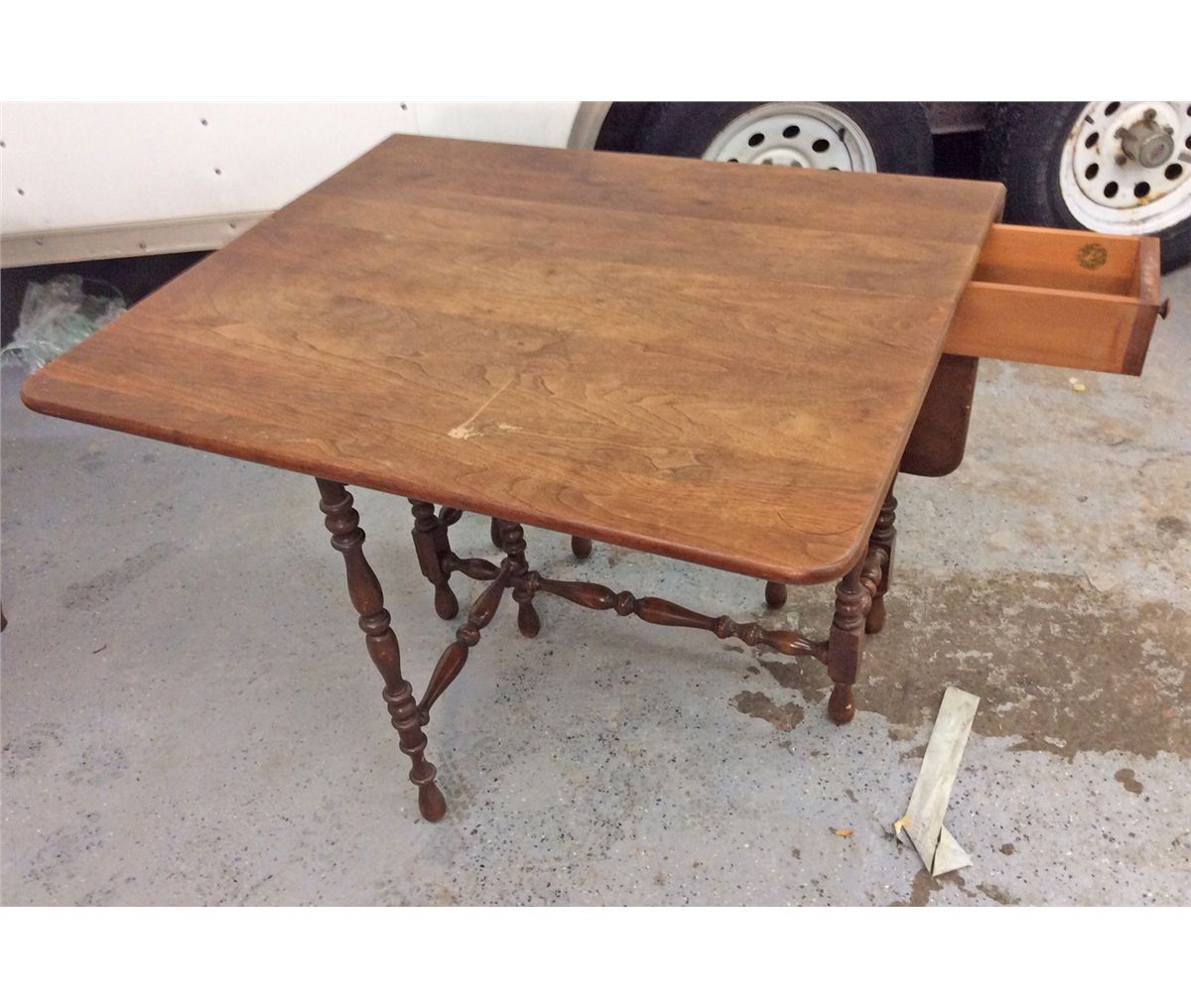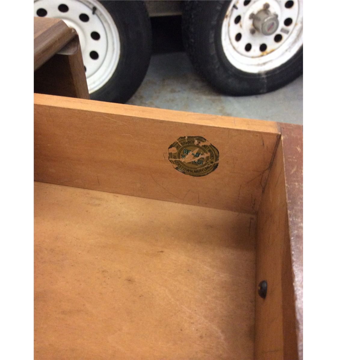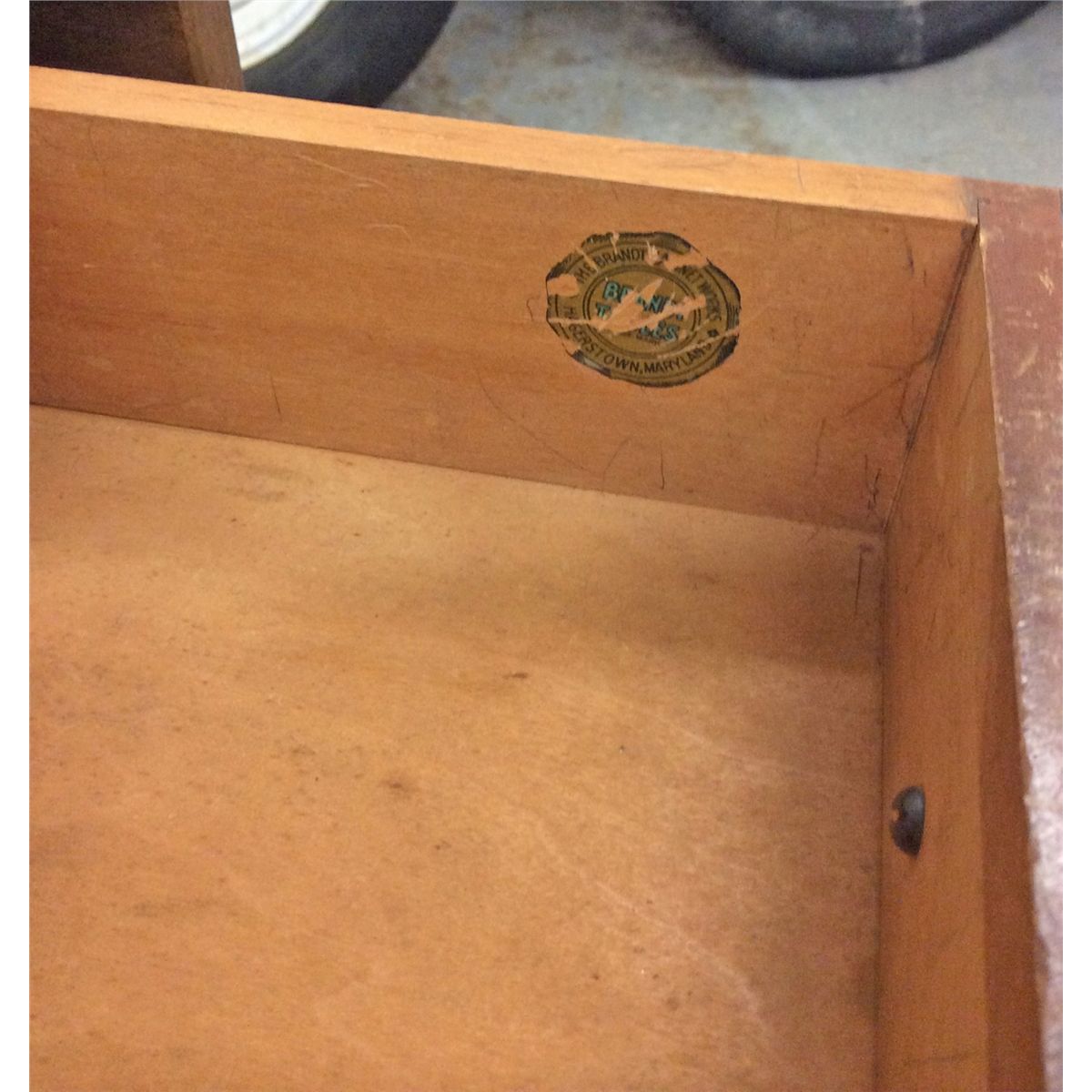 One single dove drawer– stamped with The Brandt Tables Works, Hangerstrum, Maryland
