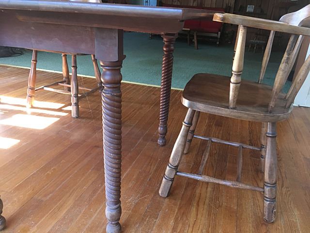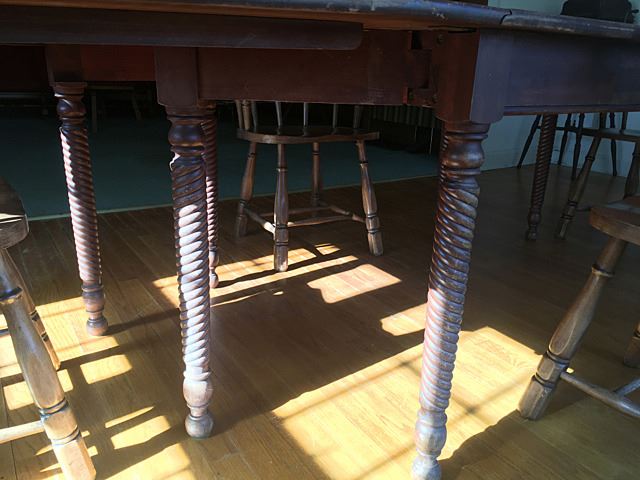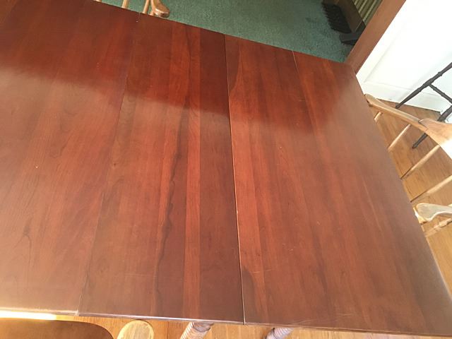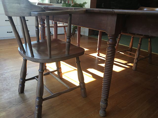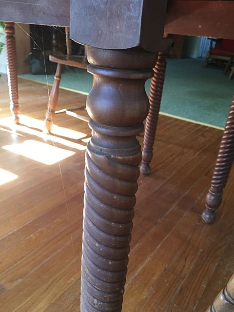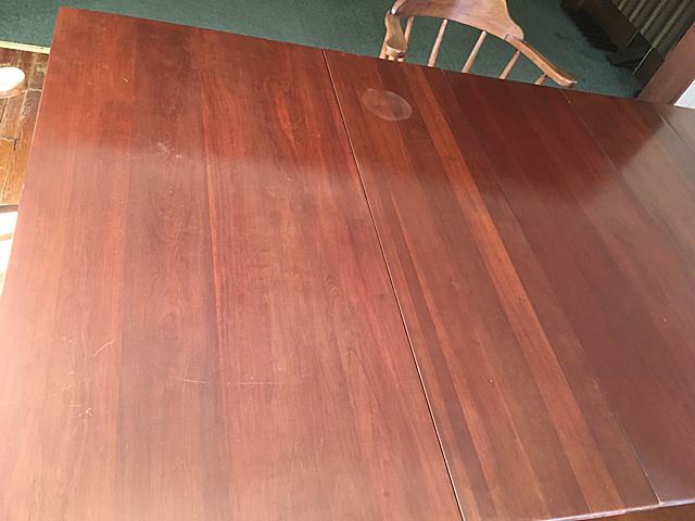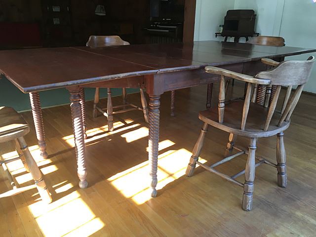 Drop leaf table with Sheraton style legs, in mahogany or cherry with 4 chairs, from the farm.