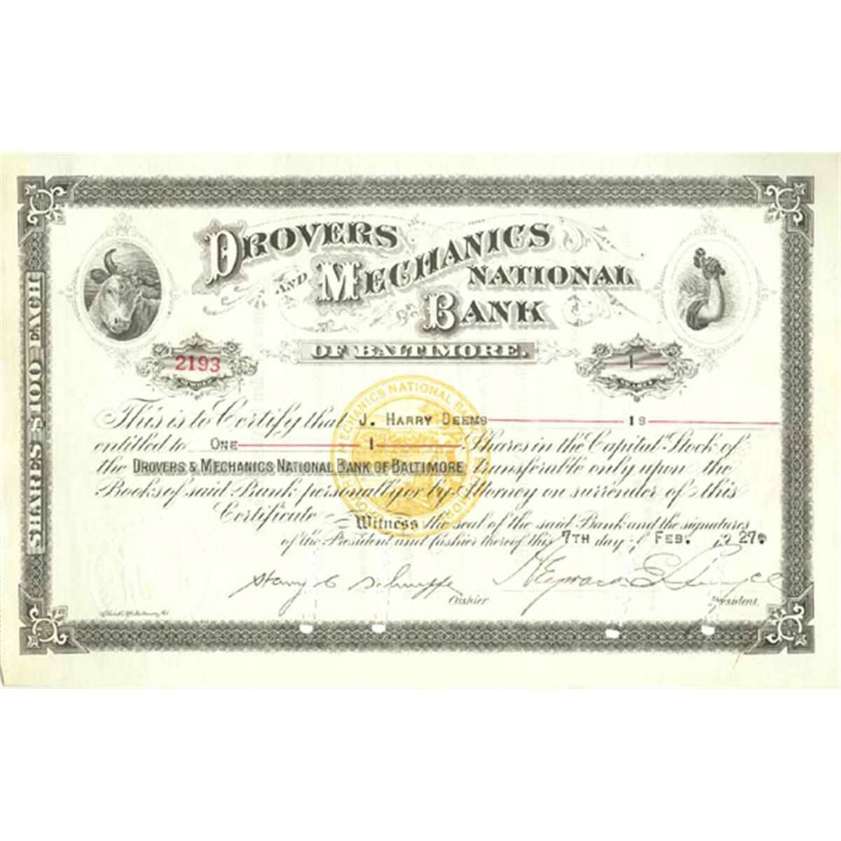 1927. Maryland. Stock certificate for 1 share. Black. Vignette of cow's head at top left and hand and mallet at top right.