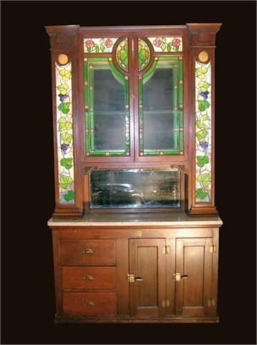 Drug store back bar/L.A. Becker Co., Chicago Ill., 8' x 59" x 17", Oak with leaded glass doors & panels/marble top/original hardware & brass plaque/beveled mirror. This is an excellent size that would fit in any house. Great patina.