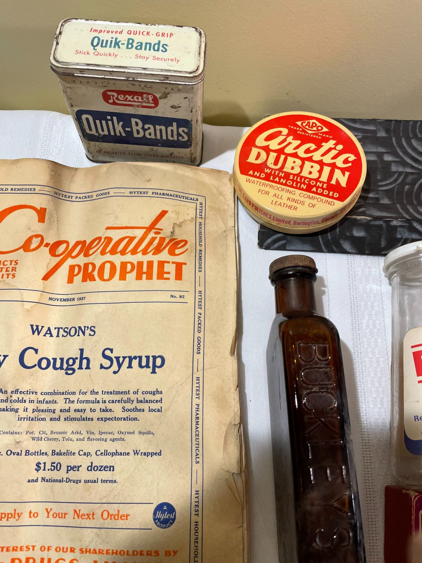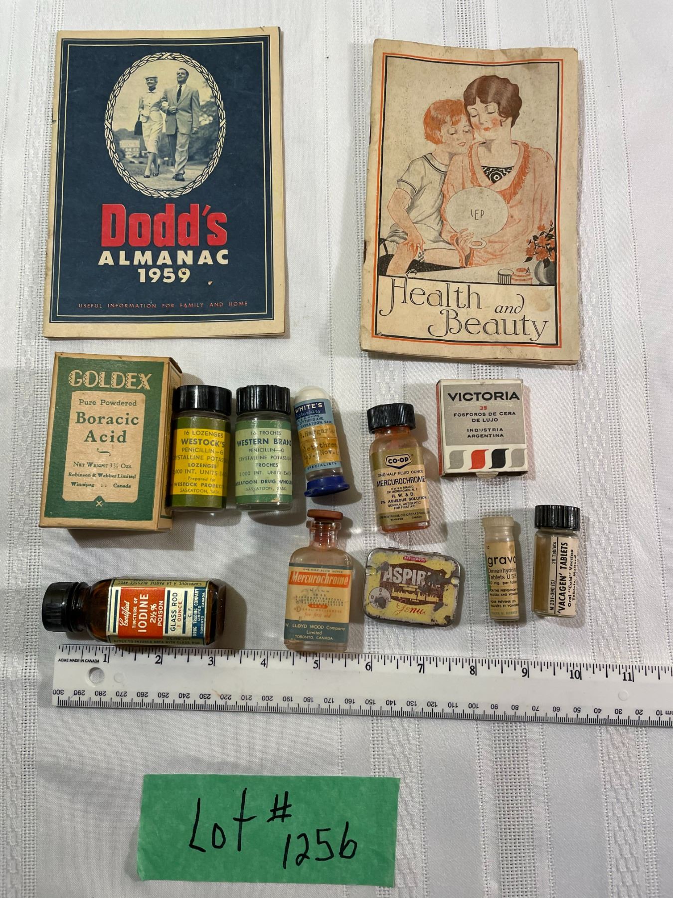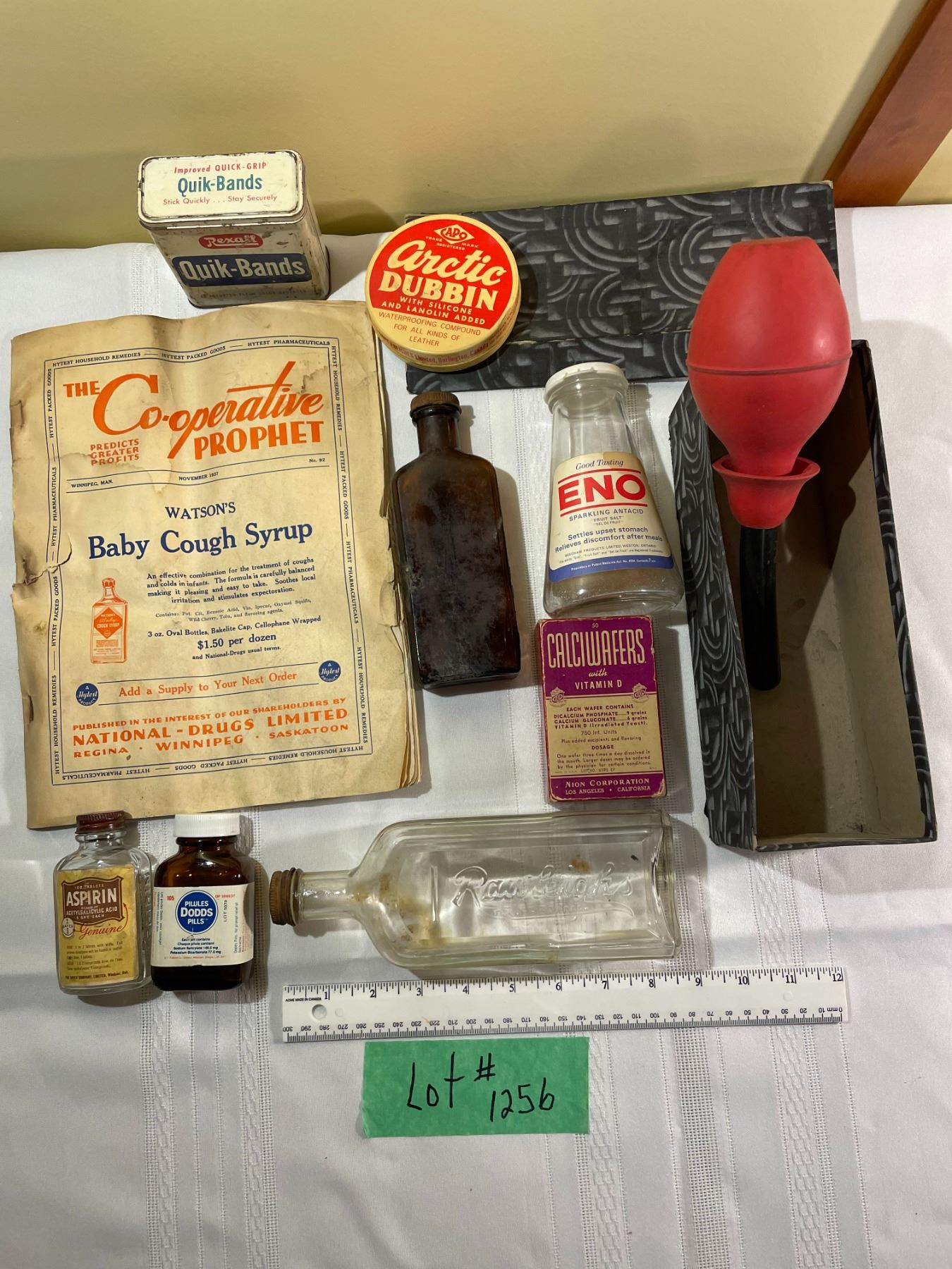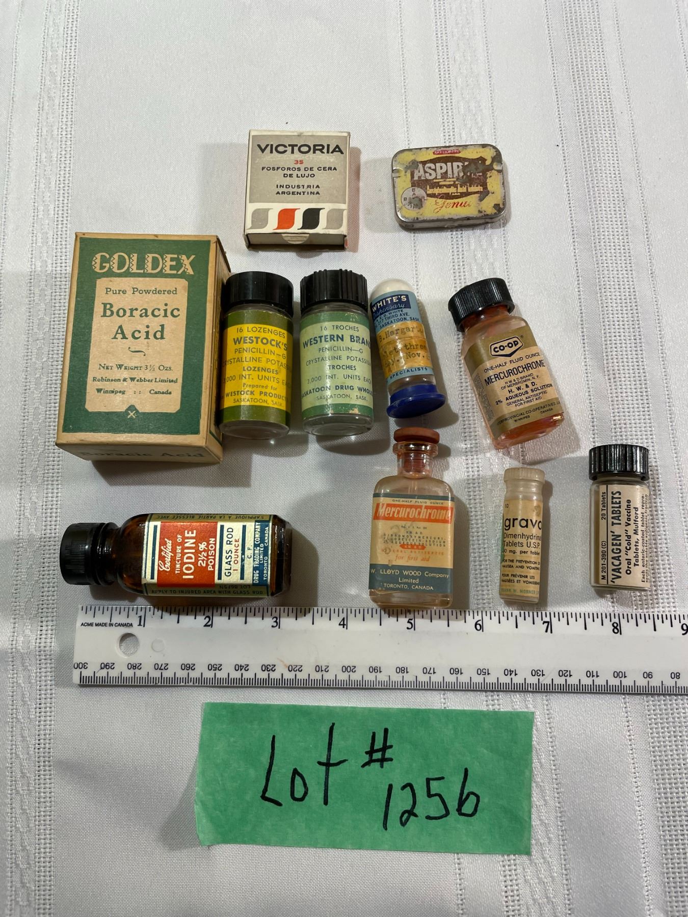 (1) Magazine " The Cooperative Prophet" November 1937 #92 (1) Special Doache - Madison Company (1) Rawleigh's Clear Glass Bottle with Metal Cap (1) Eno Glass bottle with lid - Plastic lid (1) Brown buckley"s bottle with metal cap (1) Old aspirin bottle (1) Bottle - Dodds Pills (1) Box from Calciwafers with Vit D - nion Corporation (1) Metal Rexall Quick- Bands (1) Metal Round Container filled - Artic Dubbin Water proofing compound (1) Goldex Pure Powdered Boracic Acid 3 1/2 oz. Robinso + Weber ltd - Winnipeg (1) Bottle from Tincture of Iodine - 1 oz. Drug trading Co. LTD- Toronto (1) Glass Bottle from Mercurochrome W. Lloyd Wood Company Ltd. - Toronto (1) Glass Bottle from Co-Op 1/2 Fl. oz Mercurochrome -Winnipeg (1) Glass Bottle Gravel Tabs (1) Glass Bottle Vacagen Tabs - Oral Cold tabs USE Sharp + Dohme (1) Glass Bottle - Western Brand Penicillin (1) Glass Bottle 16 Lozenges Westock'sPenicillin (1) Glass Bottle of Blaine + White perscription from Nov. 07 1958 (1) Metal Aspirin Tin (1) Cardboard matches Holder Victoria from Argentina (1) Booklet - Dodd's Almanac 1959 (1) Health and Beauty Booklet - 1929 Lydia E. Pinkham Medicine Co.