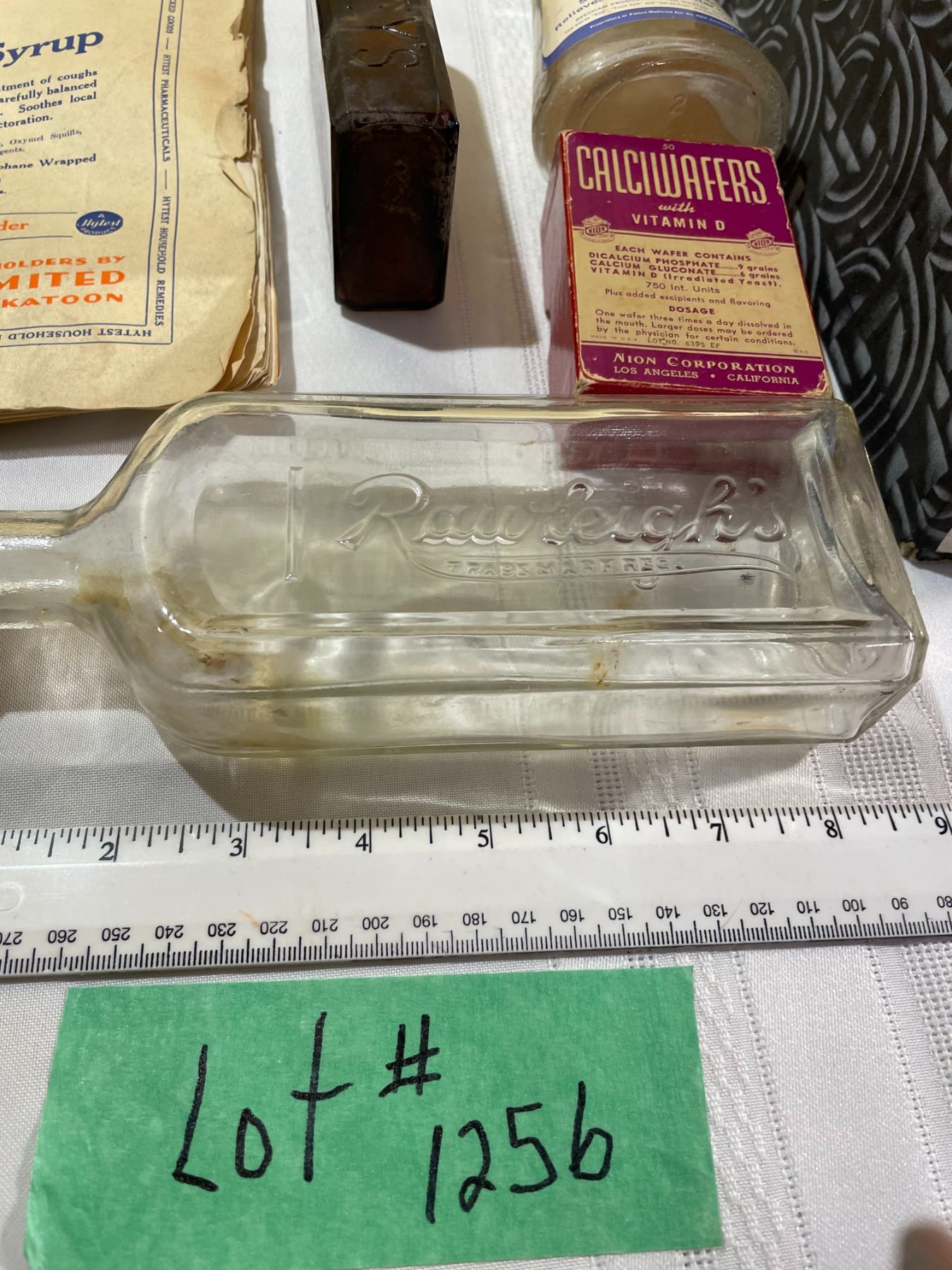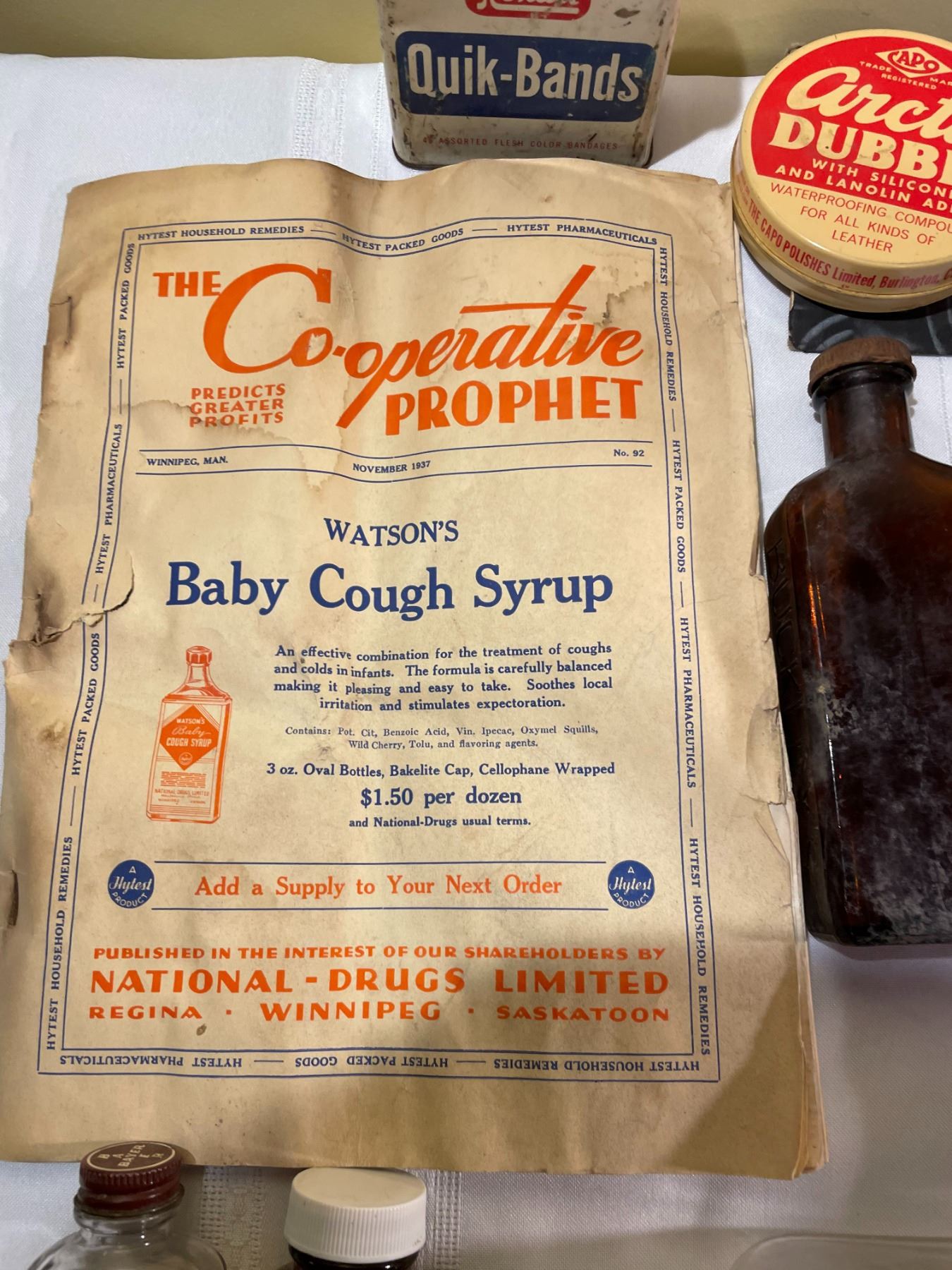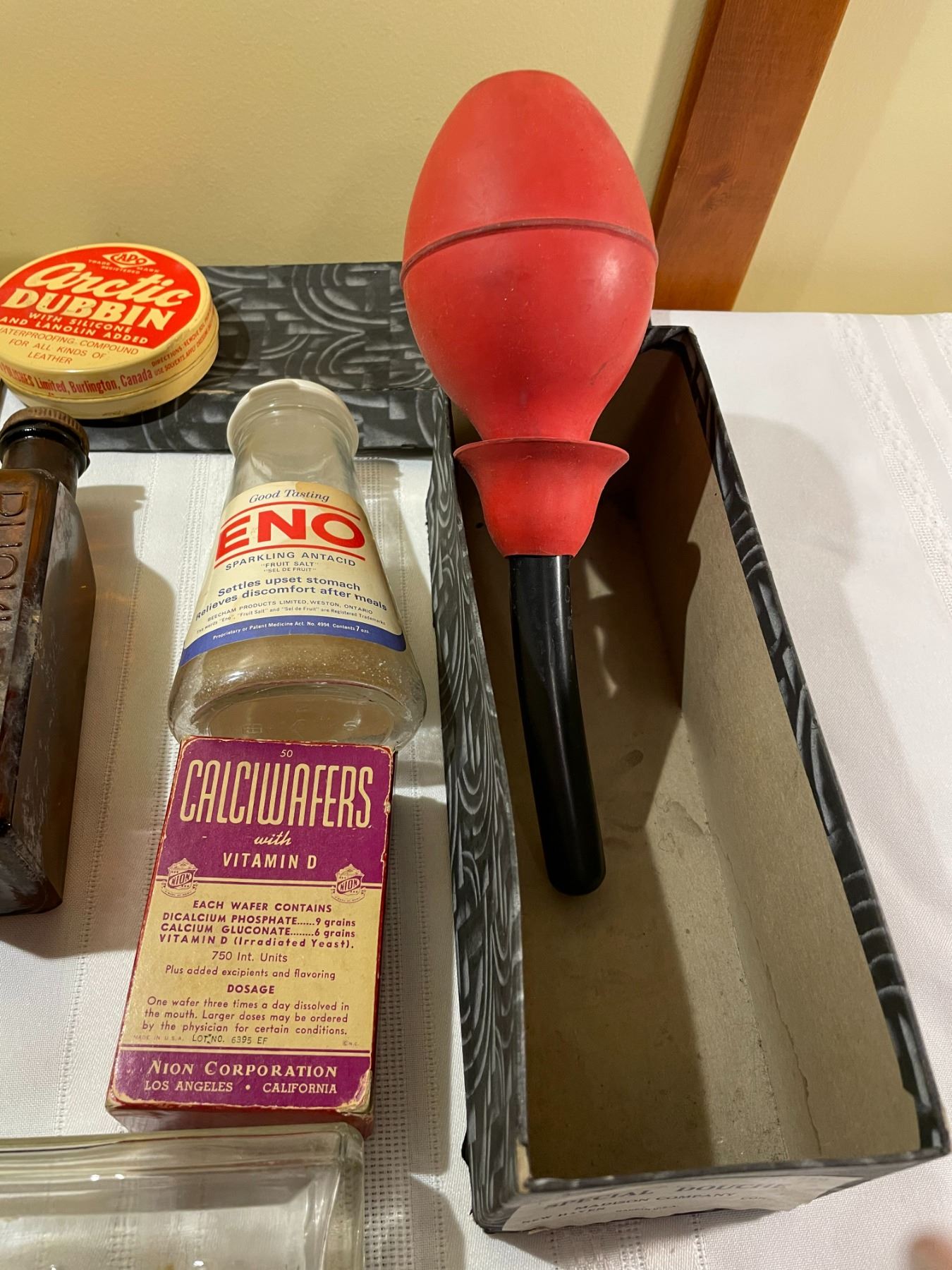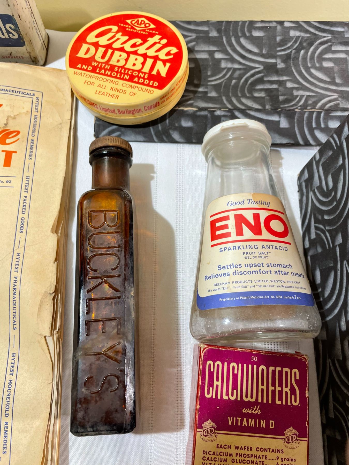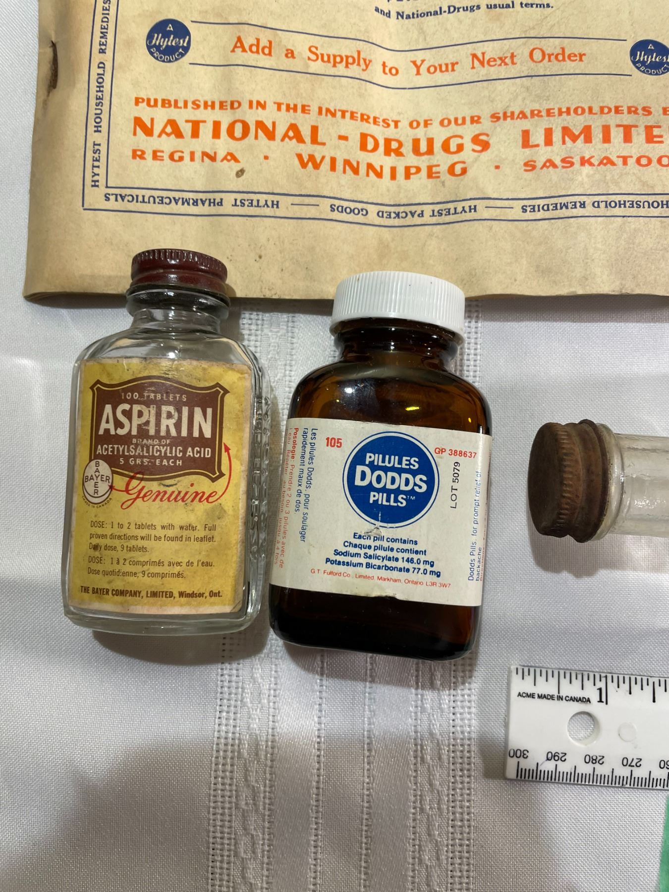 (1) Magazine " The Cooperative Prophet" November 1937 #92 (1) Special Doache - Madison Company (1) Rawleigh's Clear Glass Bottle with Metal Cap (1) Eno Glass bottle with lid - Plastic lid (1) Brown buckley"s bottle with metal cap (1) Old aspirin bottle (1) Bottle - Dodds Pills (1) Box from Calciwafers with Vit D - nion Corporation (1) Metal Rexall Quick- Bands (1) Metal Round Container filled - Artic Dubbin Water proofing compound (1) Goldex Pure Powdered Boracic Acid 3 1/2 oz. Robinso + Weber ltd - Winnipeg (1) Bottle from Tincture of Iodine - 1 oz. Drug trading Co. LTD- Toronto (1) Glass Bottle from Mercurochrome W. Lloyd Wood Company Ltd. - Toronto (1) Glass Bottle from Co-Op 1/2 Fl. oz Mercurochrome -Winnipeg (1) Glass Bottle Gravel Tabs (1) Glass Bottle Vacagen Tabs - Oral Cold tabs USE Sharp + Dohme (1) Glass Bottle - Western Brand Penicillin (1) Glass Bottle 16 Lozenges Westock'sPenicillin (1) Glass Bottle of Blaine + White perscription from Nov. 07 1958 (1) Metal Aspirin Tin (1) Cardboard matches Holder Victoria from Argentina (1) Booklet - Dodd's Almanac 1959 (1) Health and Beauty Booklet - 1929 Lydia E. Pinkham Medicine Co.