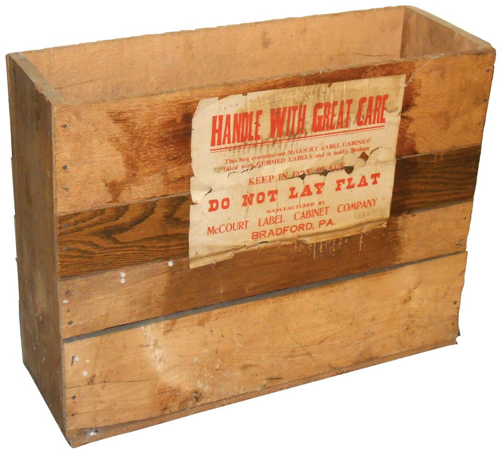 Drug store McCourt Label Cabinet, wood 4-drwr from McCourt Label Cabinet Co.-Bradford, PA, NOS in orig shipping crate, a rare find in Exc cond, 16.5"H x 23"W x 7"D.