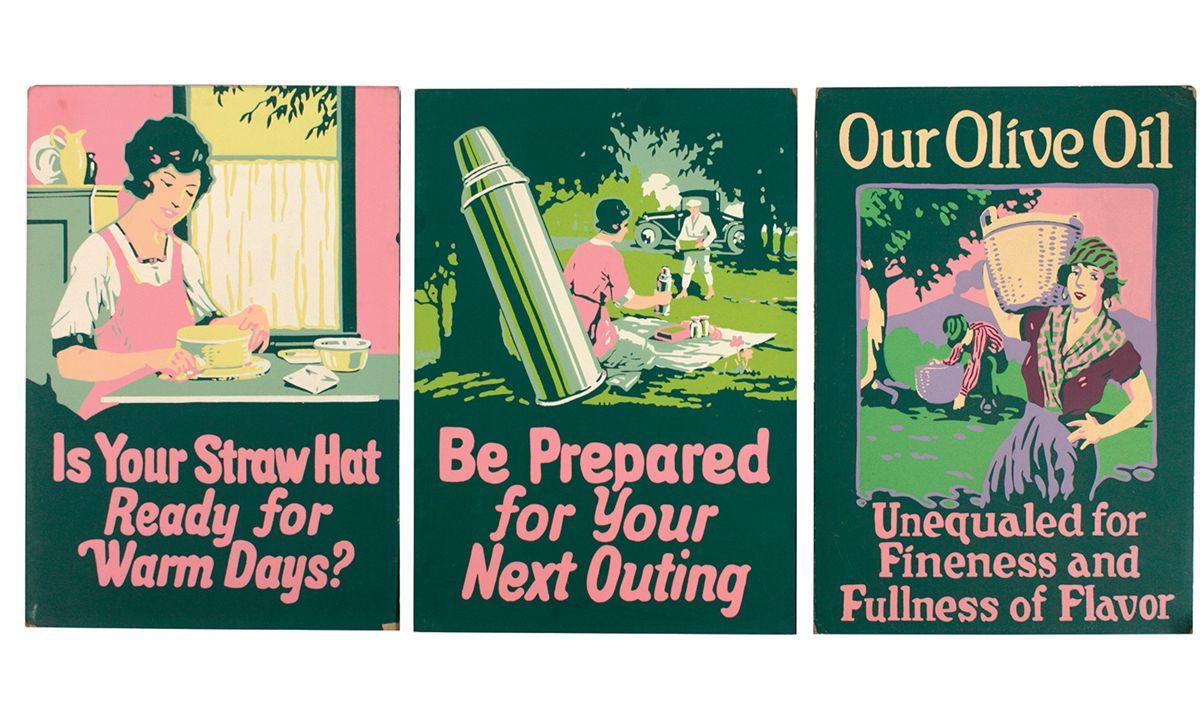Drug store product display signs (3), 1930's hand-printed serigraphs on cdbd, colorful orig silkscreens used to promote products sold, Exc cond w/minor edge wear, 20"H x 14"W.