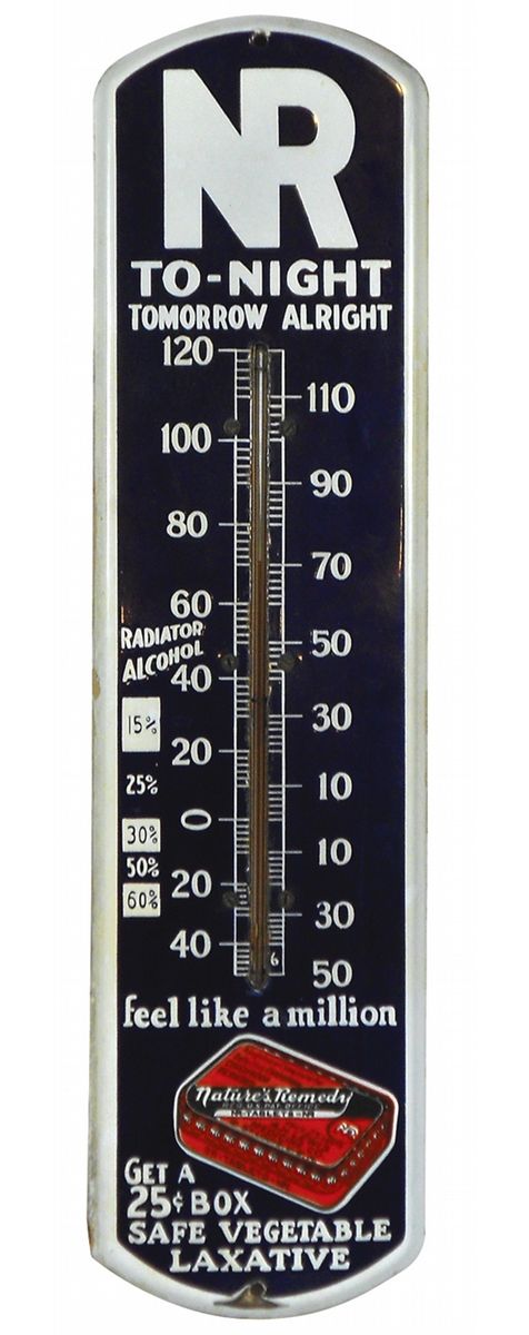 Drug store thermometer, Nature's Remedy Safe Vegetable Laxative, porcelain w/colorful 25 Cent pkg graphics, Exc cond w/some loss around bottom mounting hole, 27"H x 7"W.