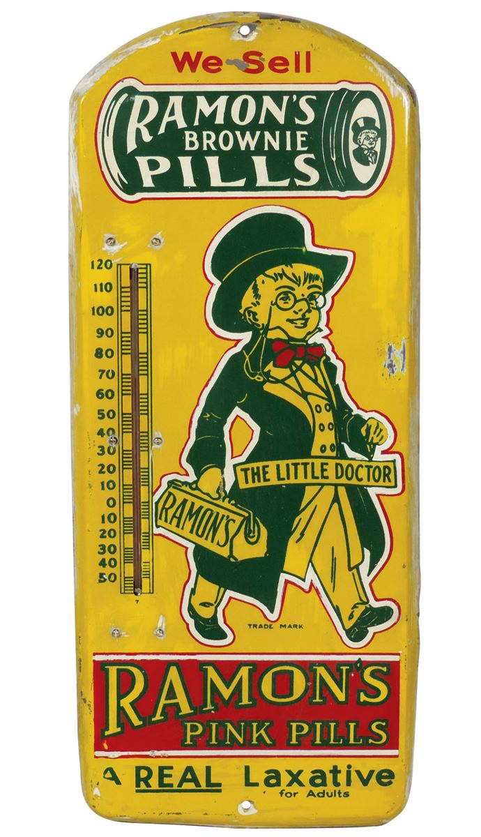 Drug store thermometer, Ramon's Brownie Pills & Pink Pills-A Real Laxative for Adults, litho on metal w/cute Little Doctor graphics, VG cond, 21"H x 9"W.