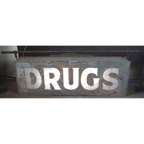 "Drugs" Lighted Sign 1920's double sided w/ Original hanging pole hardware plastic behind open letters replacing original milk glass in metal can - sign is 63" x 22" x 8"