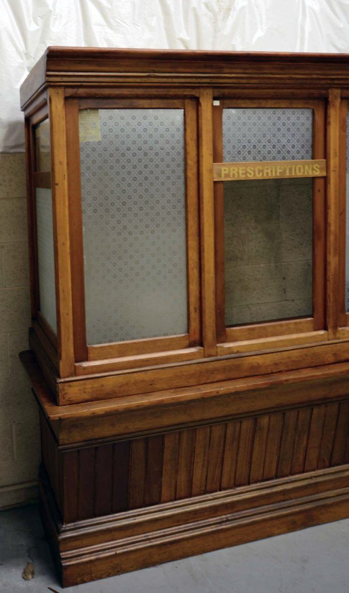 Has etched glass and mirrors. "Prescriptions, Cigars, Drugs, Sodas." Circa 1910. Condition (Very good). Size 67" x 74-1/2 x 28"