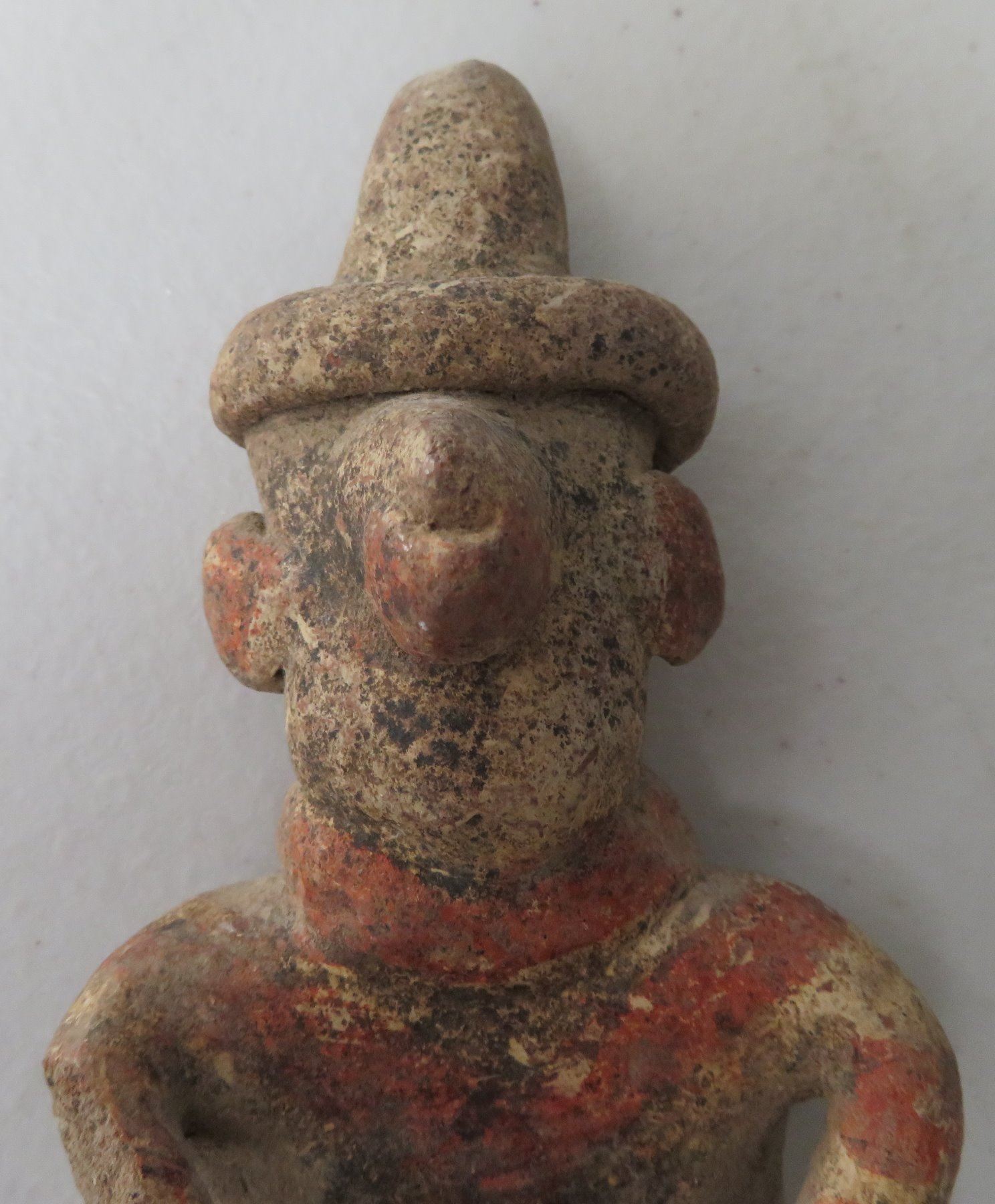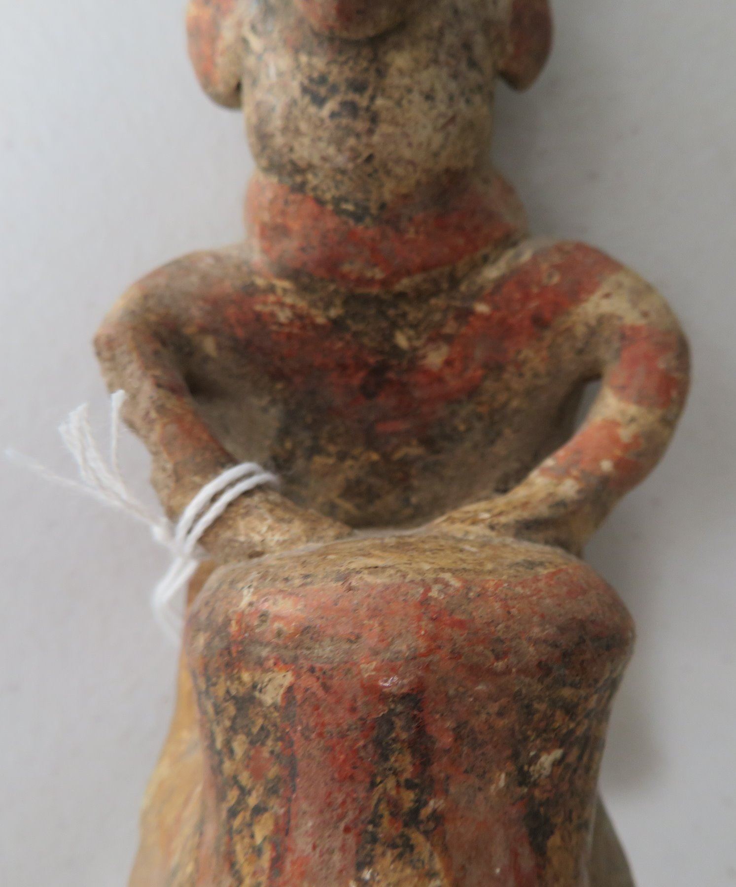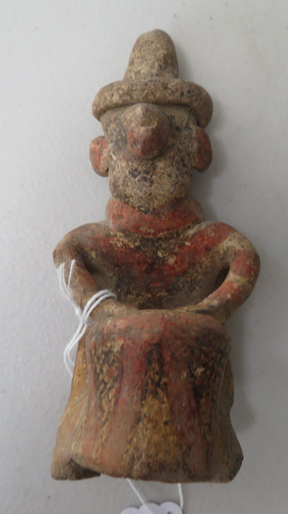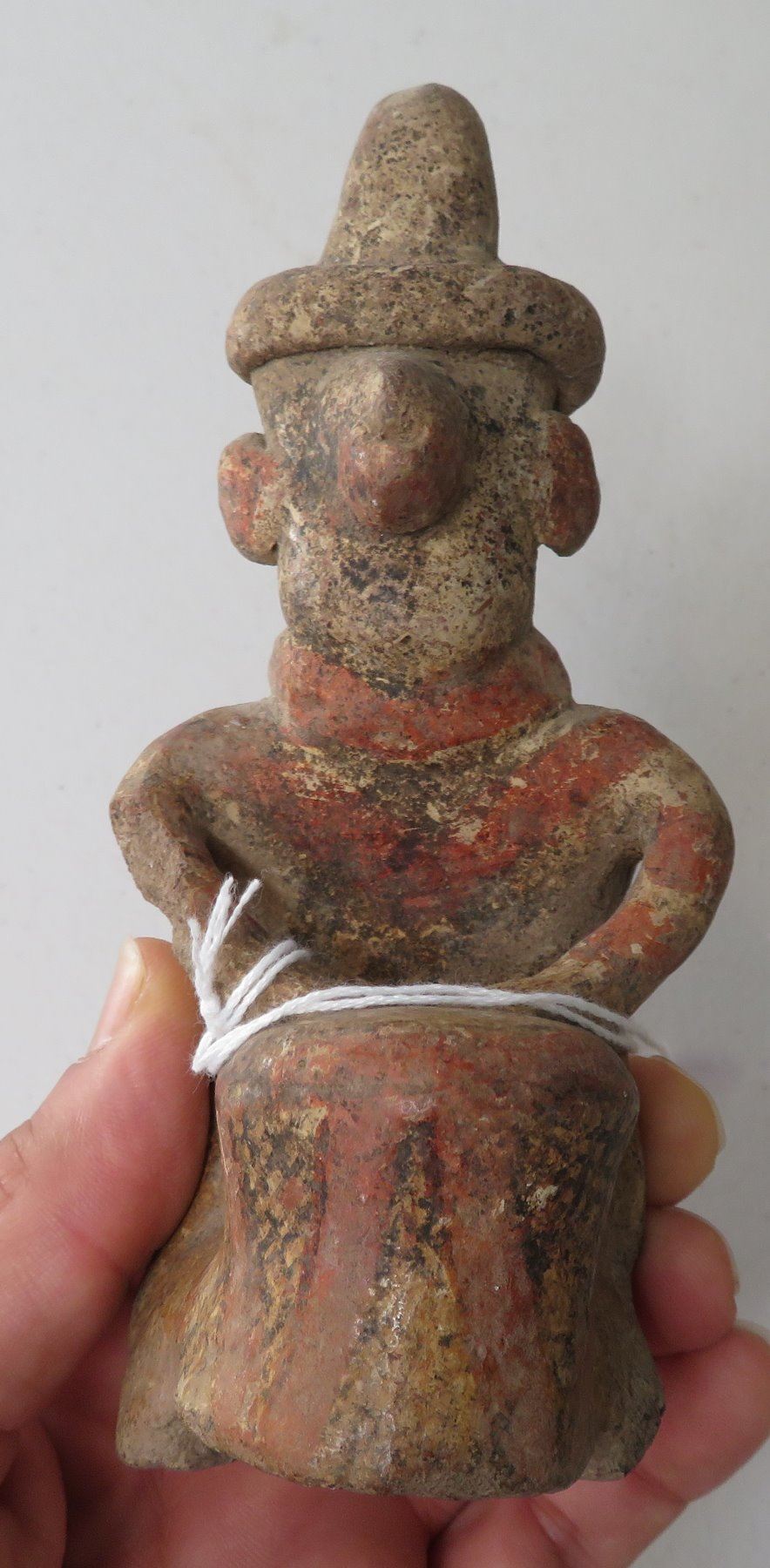 Drum Player, pre-Columbian item. Made of clay and paint, the item measures 5 1/2" x 2" x 2". Jalisco, Mexico. From an old and large, Rancho Sante Fe, Calif. estate, originally collected by a dentist. Condition: Chip on foot and arm, see images. Shipping: $26.50 w/insurance and signature, wrapped.