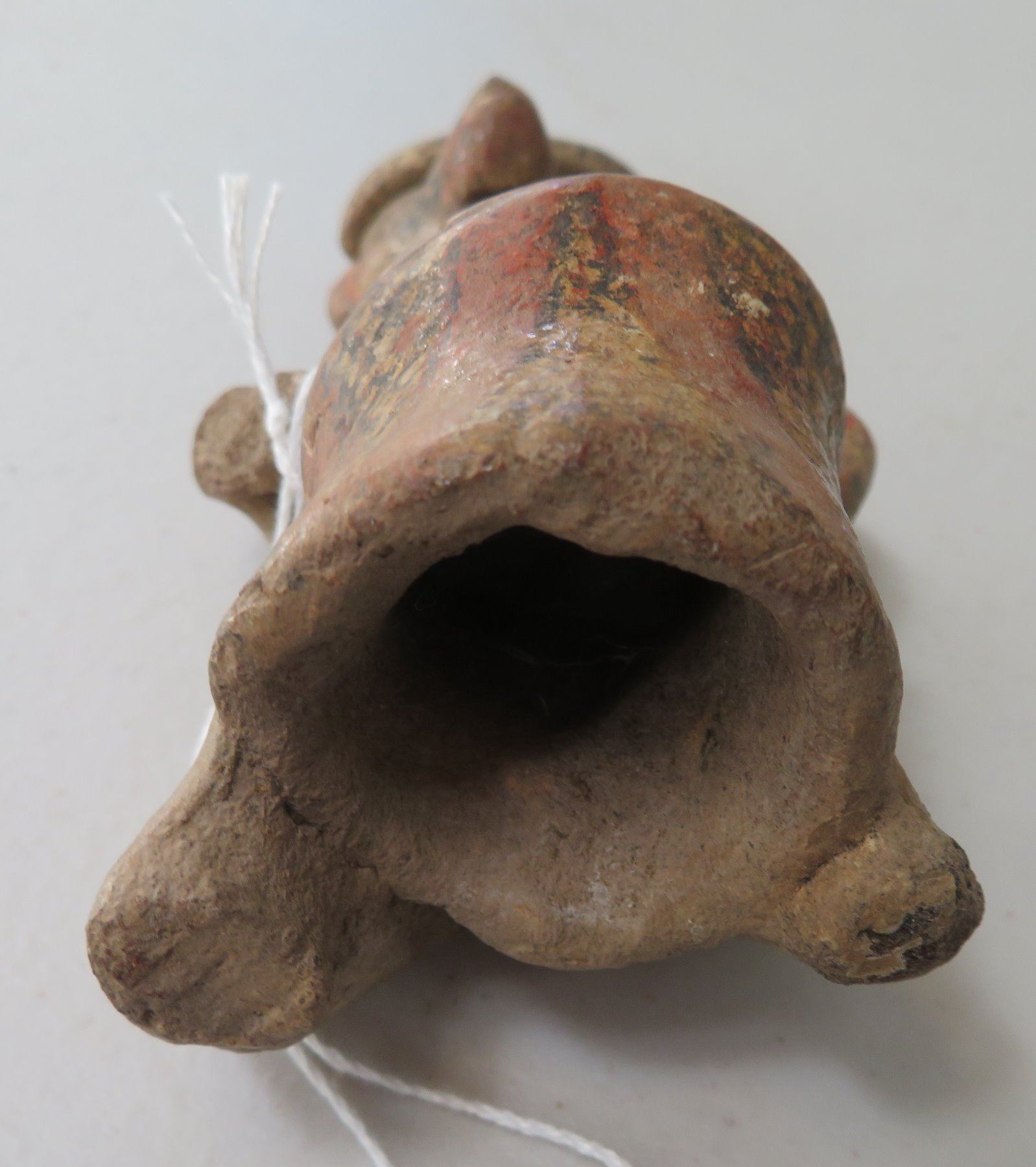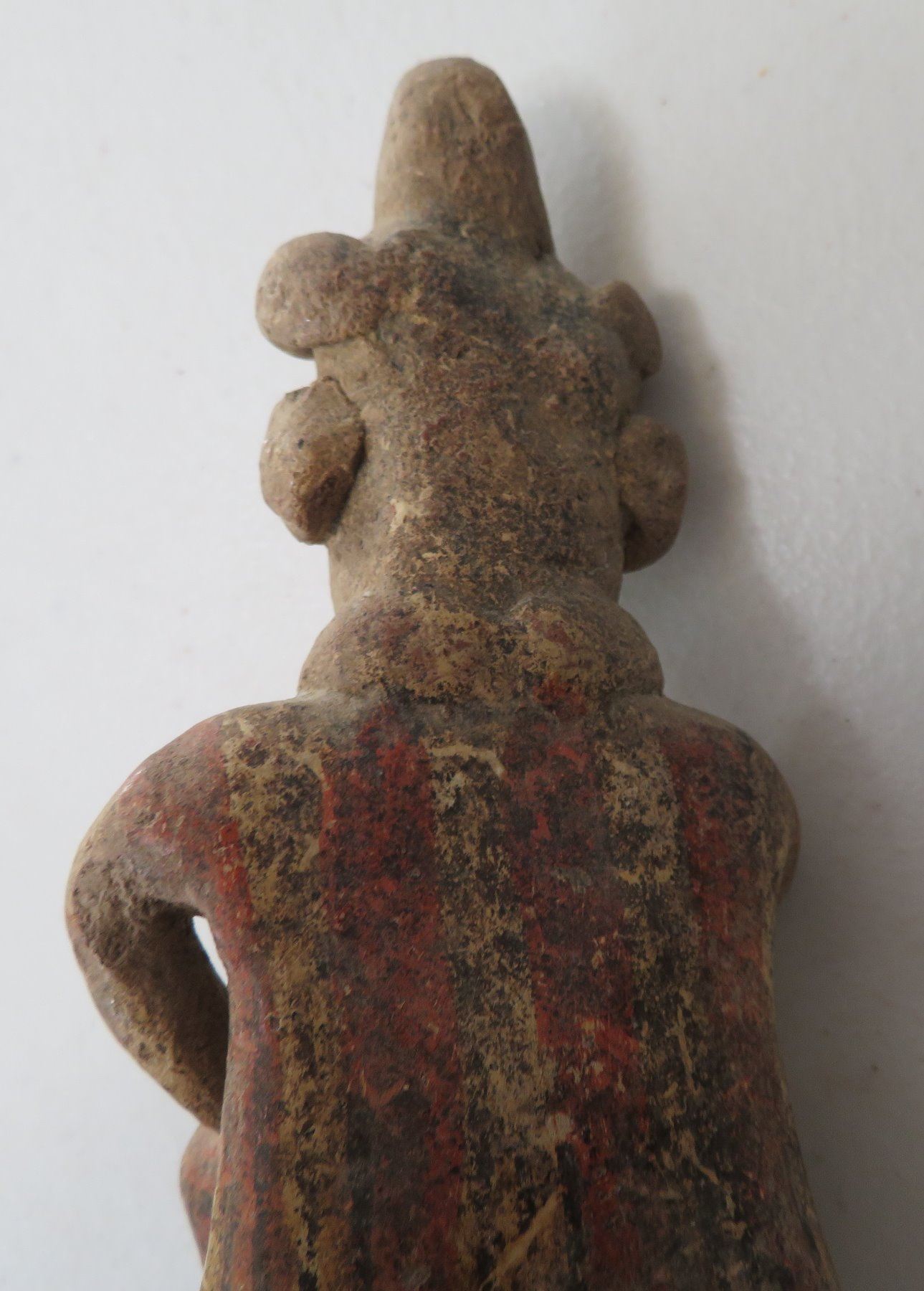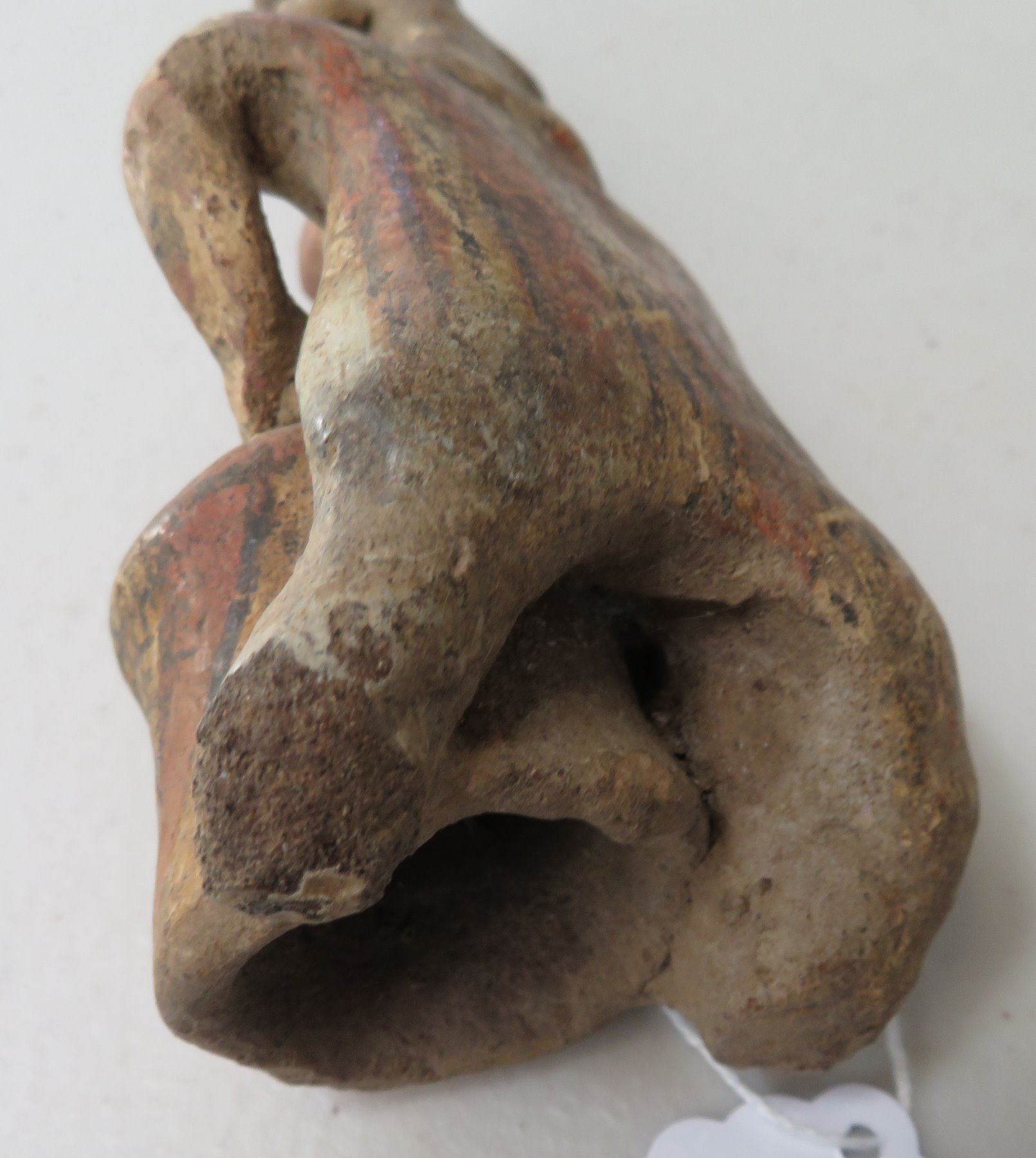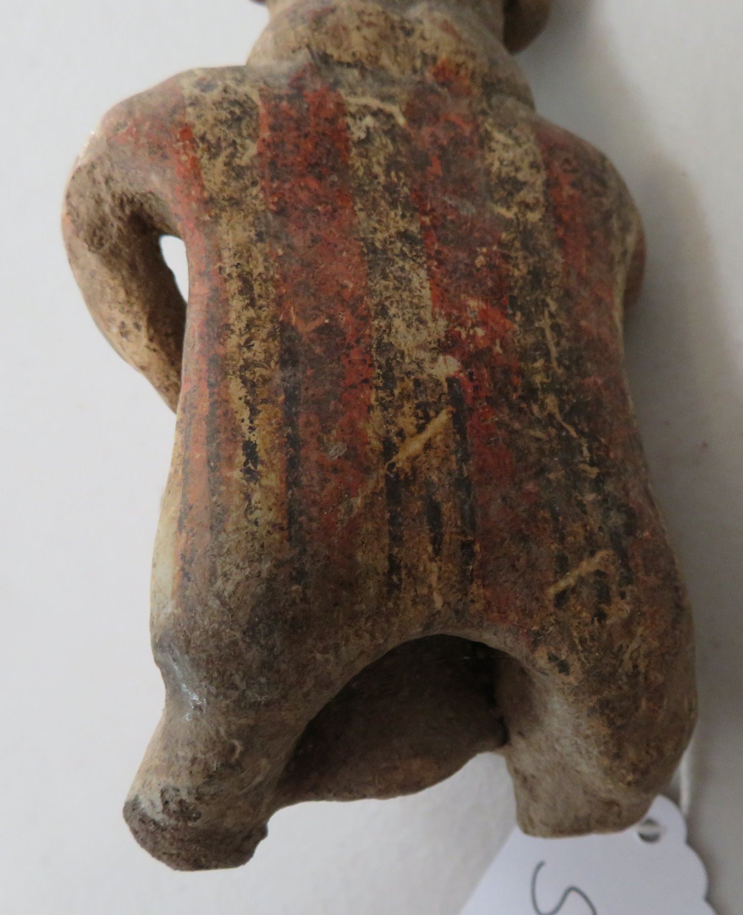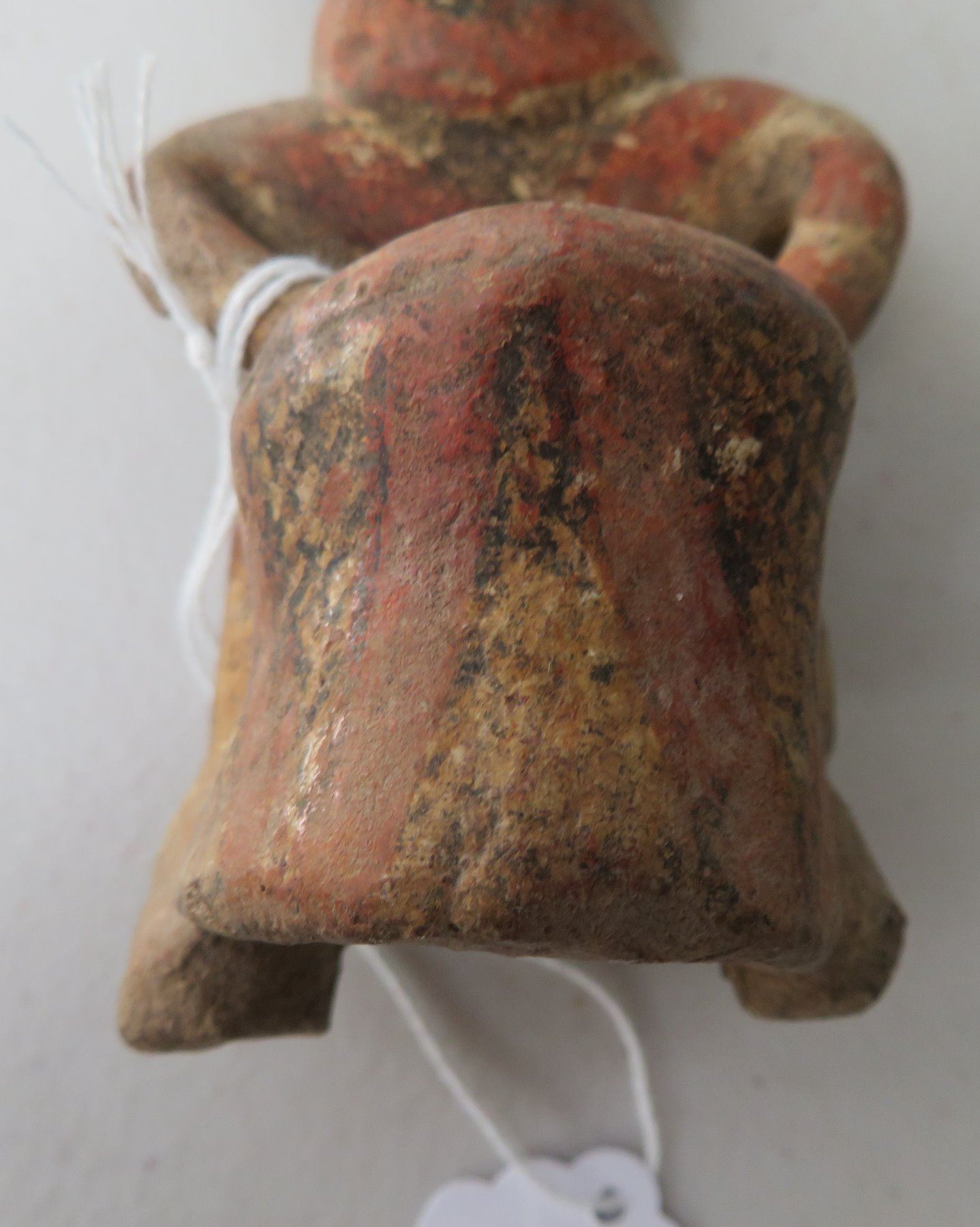 Drum Player, pre-Columbian item. Made of clay and paint, the item measures 5 1/2" x 2" x 2". Jalisco, Mexico. From an old and large, Rancho Sante Fe, Calif. estate, originally collected by a dentist. Condition: Chip on foot and arm, see images. Shipping: $26.50 w/insurance and signature, wrapped.