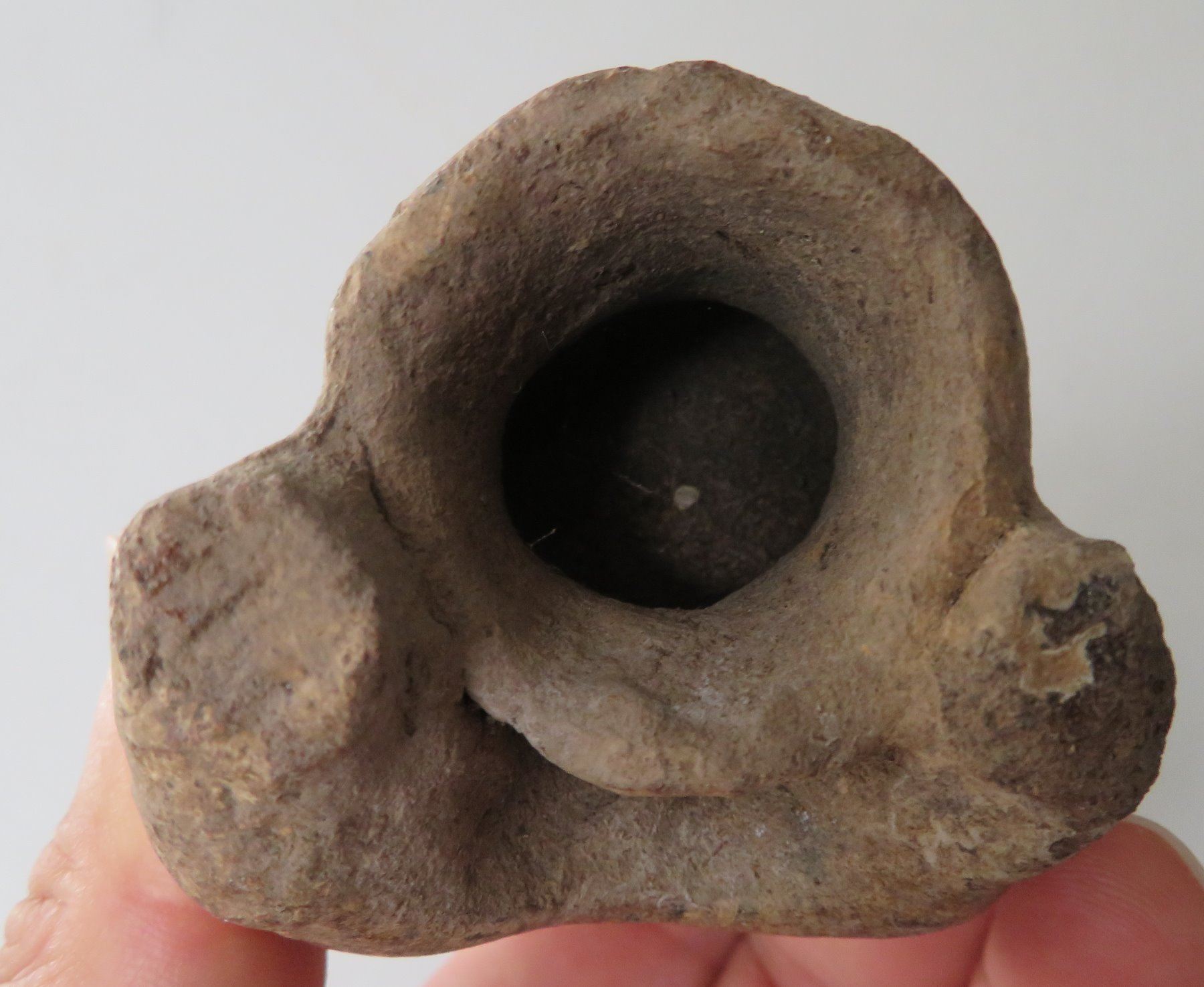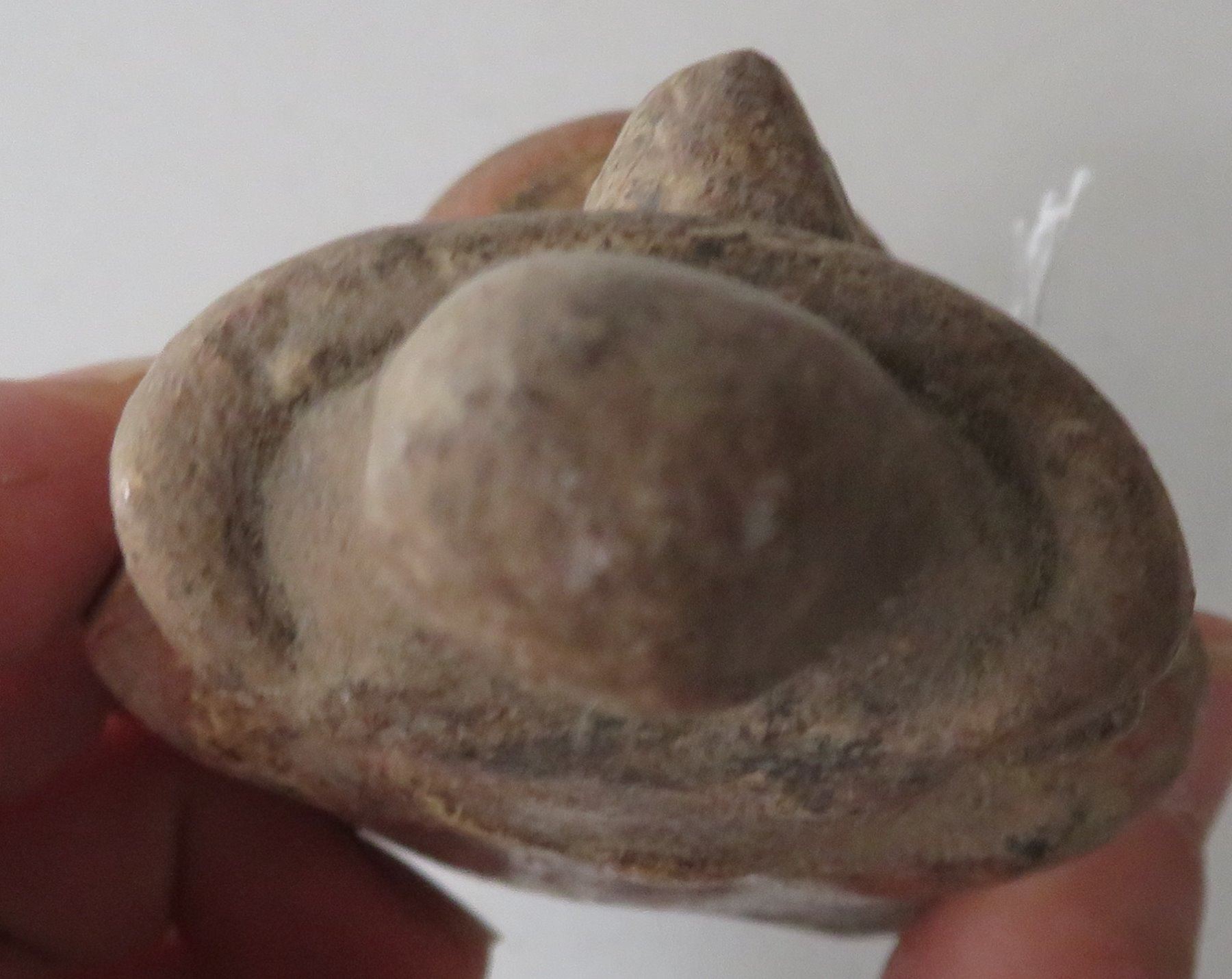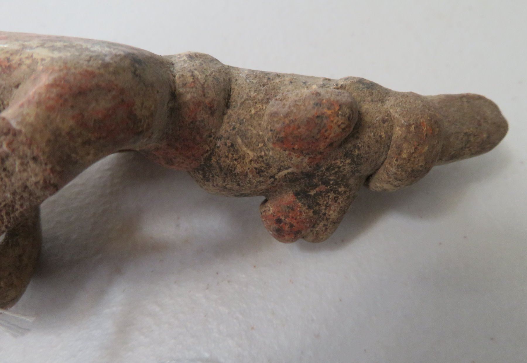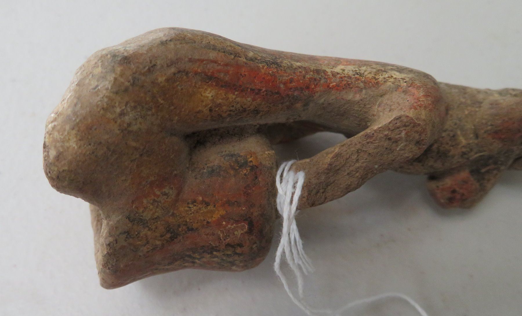 Drum Player, pre-Columbian item. Made of clay and paint, the item measures 5 1/2" x 2" x 2". Jalisco, Mexico. From an old and large, Rancho Sante Fe, Calif. estate, originally collected by a dentist. Condition: Chip on foot and arm, see images. Shipping: $26.50 w/insurance and signature, wrapped.