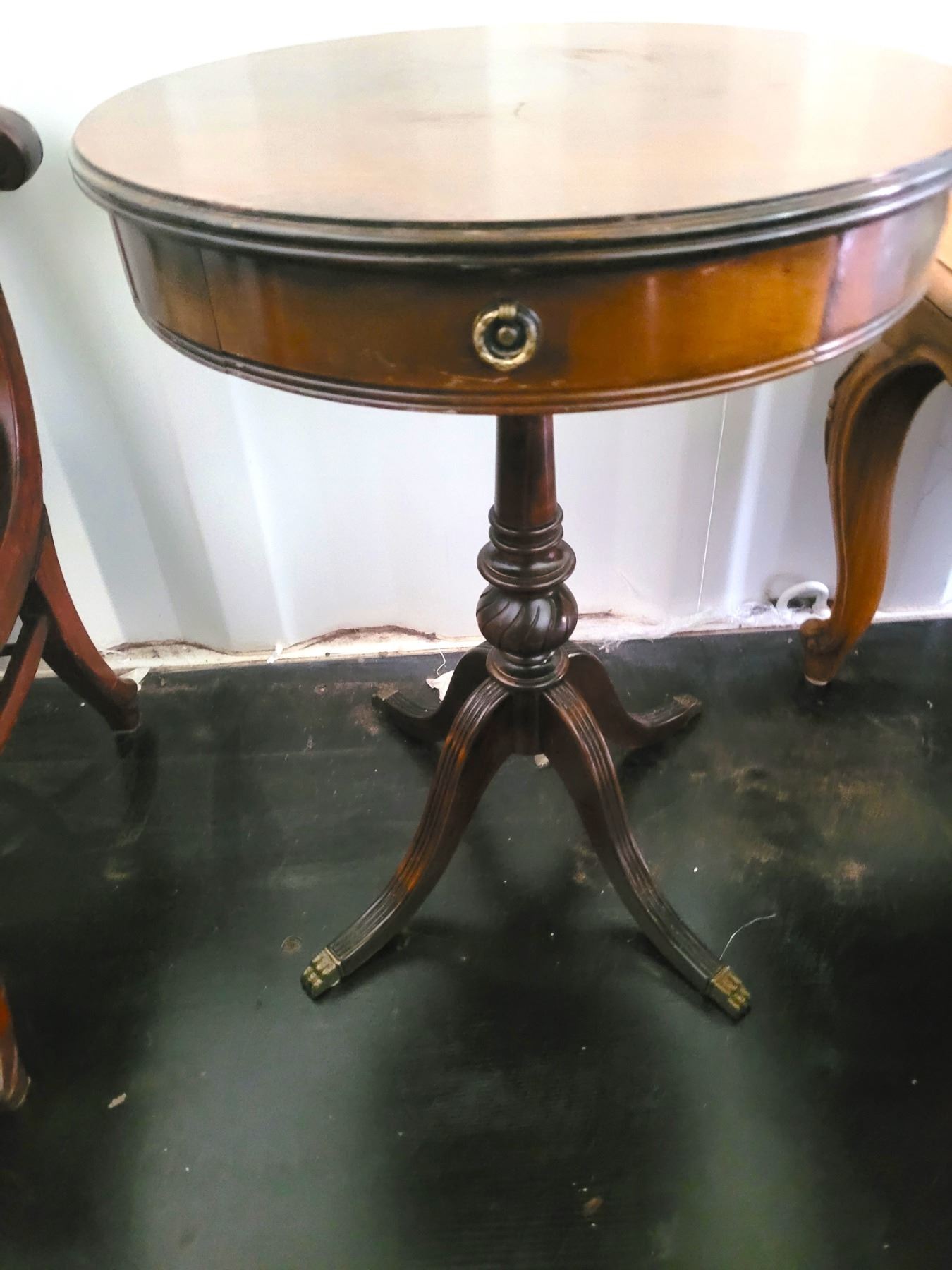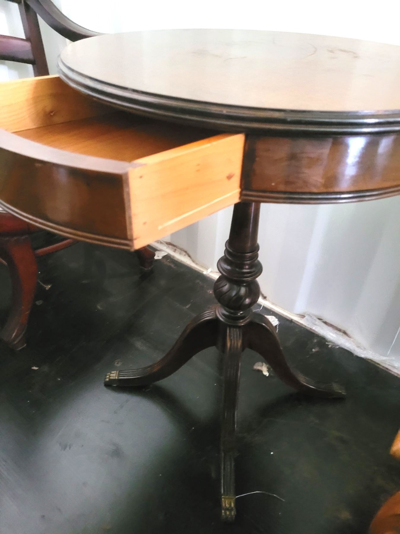Side table with one drawer, brass foot tips 20x20x26 Pickup at 11 am