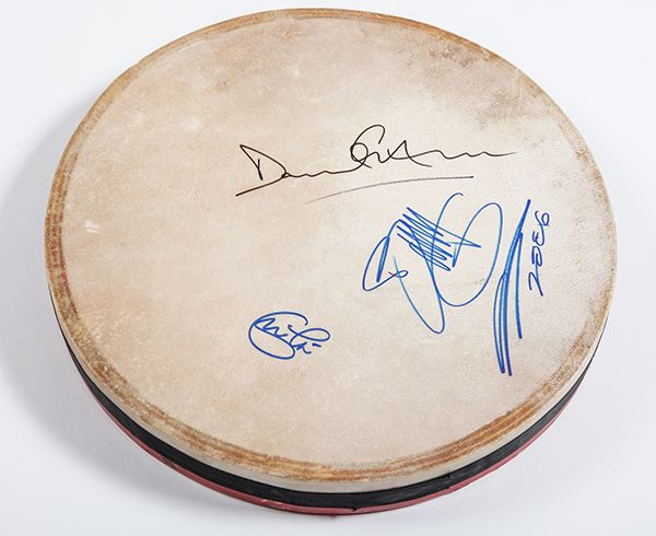 Drumhead Signed By Eric Clapton, David Gilmour, and Billy Gibbons. ERIC CLAPTON signed in blue marker; DAVID GILMOUR of Pink Floyd signed in black marker; and BILLY GIBBONS of ZZ Top signed in blue marker and put the year "2006" below his name. A nice rock and roll mix.