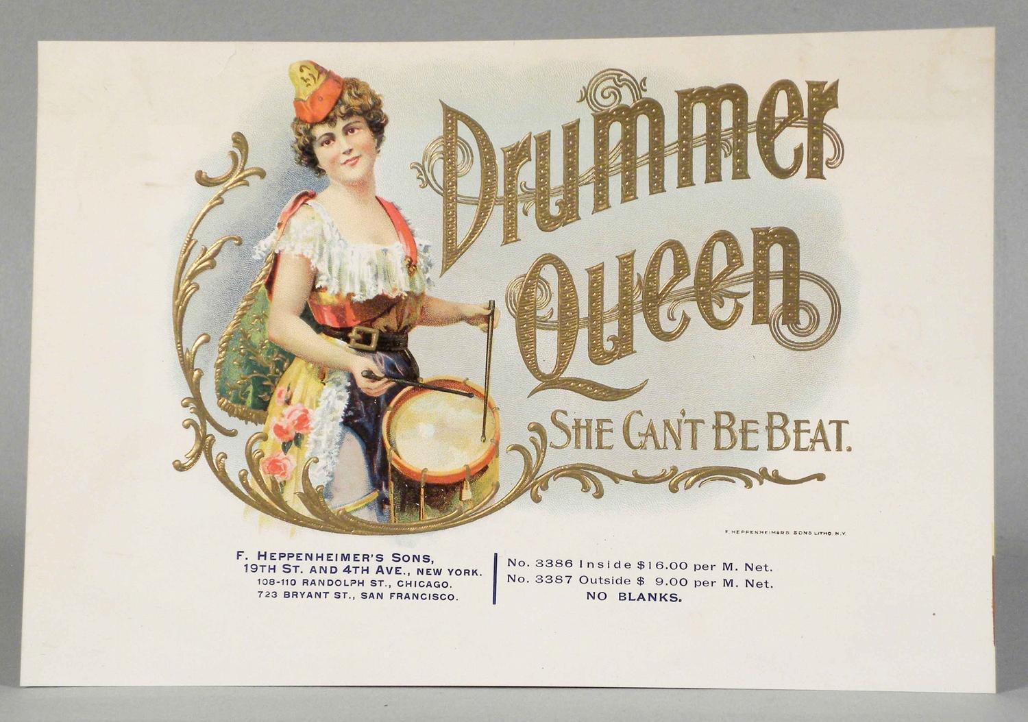 Drummer Queen Cigar Box Sample Label. F. Heppenheimer's & Sons. Embossed with gold leaf. Mint condition. 8 1/2 X 5 3/4 inches. Starting bid $100