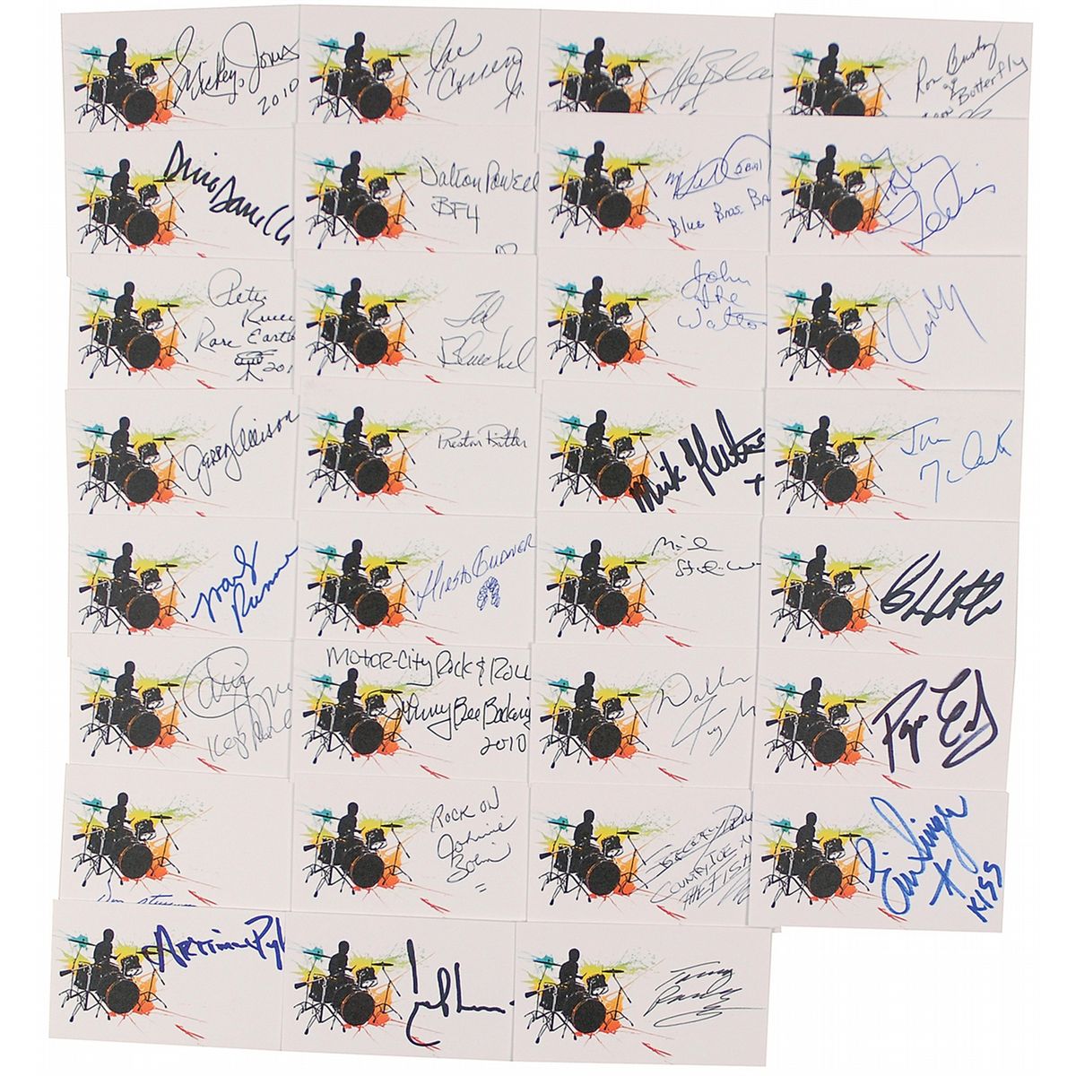 Ink and felt tip signatures of 31 drummers on individual white 3.25 x 2 custom made collector cards. Signers are: Marky Ramone, Tommy Ramone, Dalton Powell (Bobby Fuller Four), Artimus Pyle (Lynyrd Skynyrd), Joel Larson (Grass Roots), Joe Correro (Paul Revere & The Raiders), Don Stevenson (Moby Grape), Hirsh Gardner (New England), Ted Bluechel (The Association), Preston Ritter (Electric Prunes), Carmine Appice (Vanilla Fudge), Johnny Bee (Mitch Ryder & The Detroit Wheels), Eric Singer (Kiss), Roger Earl (Foghat), Ron Bushy (Iron Butterfly), Jim McCarty (Yardbirds), Mickey Jones (Dylan), Jimmie Hall (Blues Brothers), Hal Blaine, Jerry Allison (The Crickets), Johnnie Bolin, Dallas Taylor (CSN&Y), Michael Stuart Ware (Love), Mick Fleetwood (Fleetwood Mac), Greg Dewey (Country Joe & The Fish), John Ike Walton (13th Floor Elevators), Peter Rivera (Rare Earth), Dino Danelli (Rascals), Alan White (Yes), Corky Laing (Mountain), Gary Lewis (Gary Lewis & The Playboys). In fine condition.