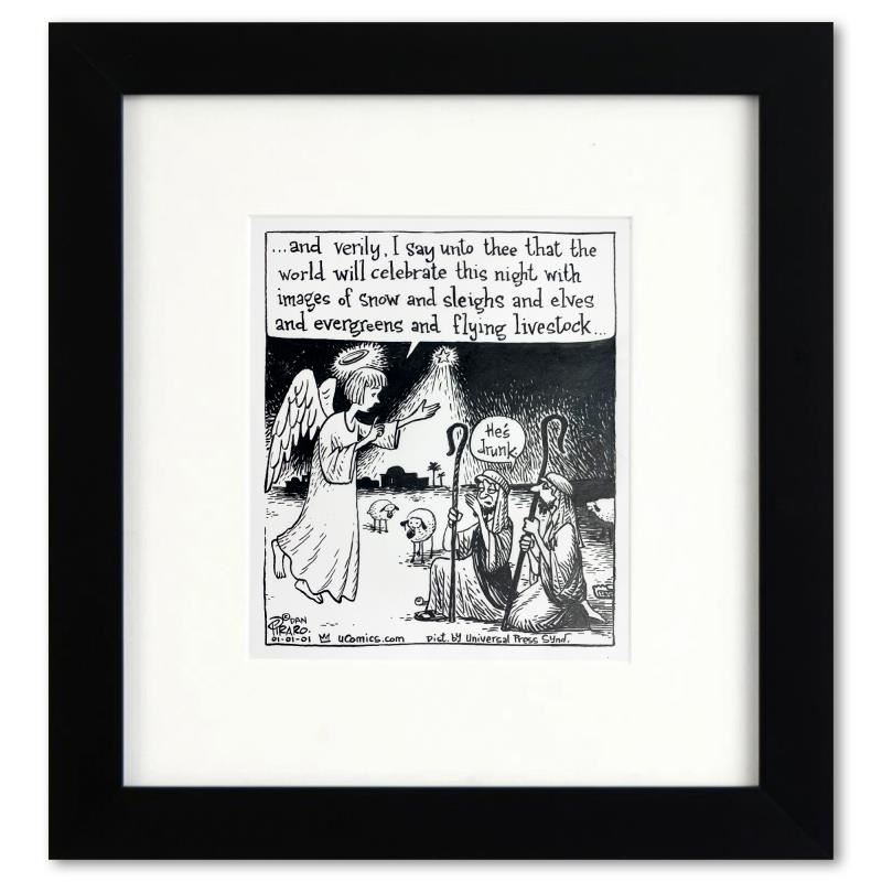 Enter a surreal and satirical world of twisted imagination and award winning creativity. "Drunk Angel" is an original pen & ink drawing on paper by Dan Piraro, creator of the critically acclaimed and award winning comic strip, Bizarro. This piece is hand signed, comes custom framed and includes a letter of authenticity. Measures approximately 12" x 11" (frame), 7" x 6" (image).This item requires special handling and may have a longer than usual turnaround.