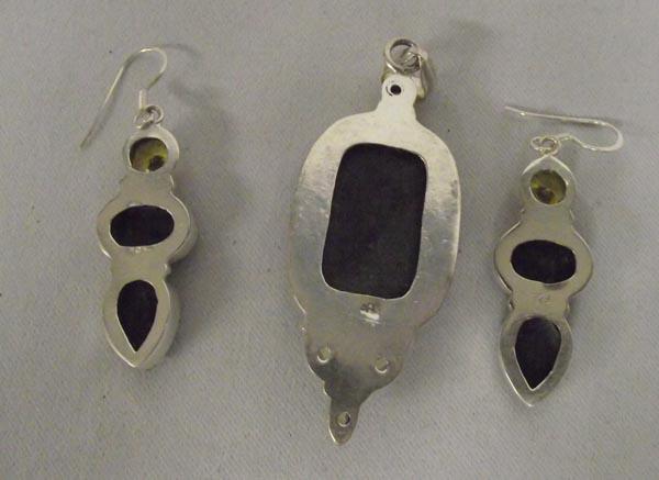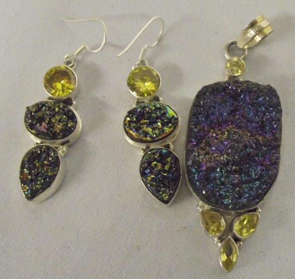 Peacock Druzy/Citrine Pendant and Earrings Set. Sterling Silver 2'' x 7/8'' length. Earrings 2.25'' long. Buyers Pay Actual Shipping and Handling Charges(see terms and conditions for more information).