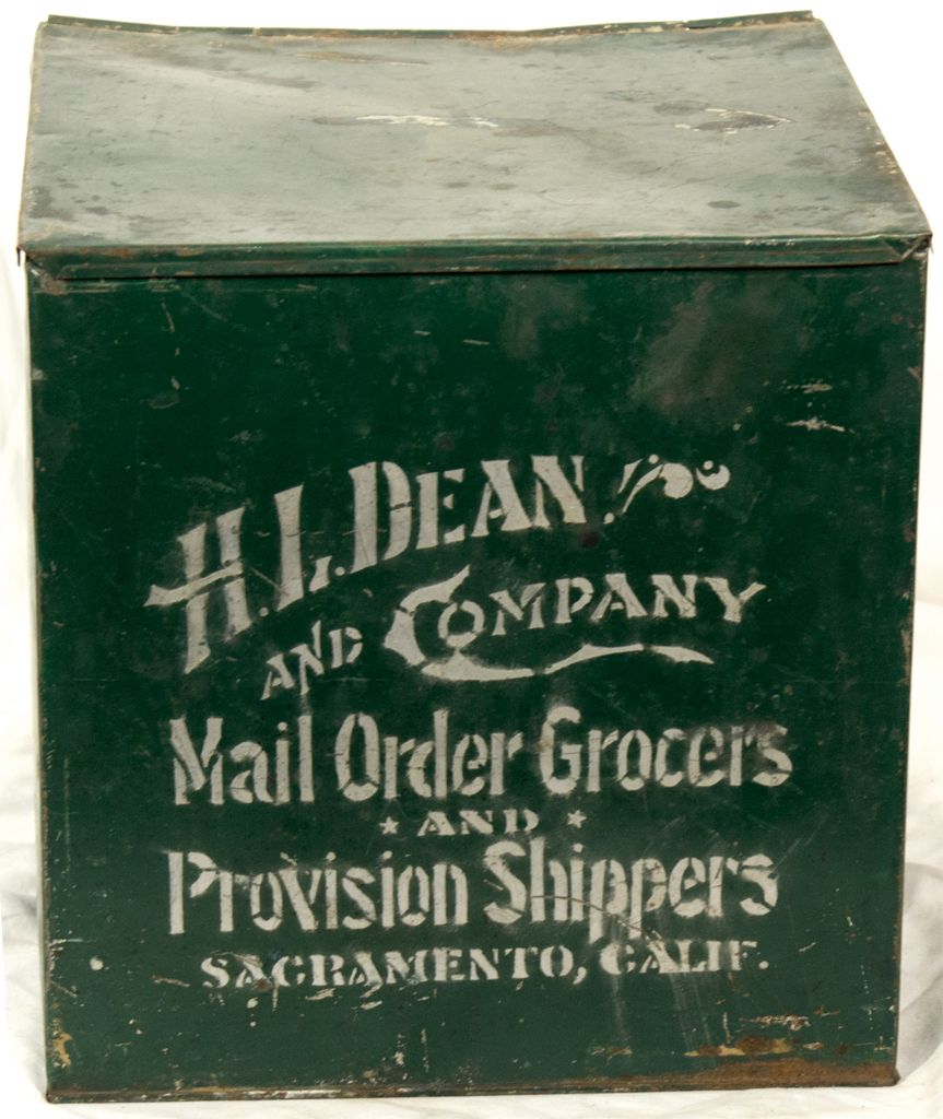 A canister from H.L. Dean and Company. Container is stenciled H.L. DEAN AND COMPANY MAIL ORDER GROCERS AND PROVISION SHIPPERS SACRAMENTO, CALIF. Piece measures 10" x 9.5", has some rust and has obviously been used, but not abused. Made of tin, this is a great piece of Americana. - Jacobitz Collection -60311