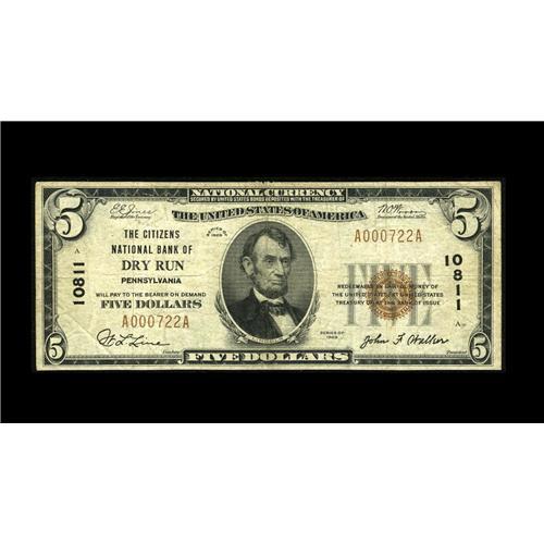 <B>Dry Run, PA</B></I> - $5 1929 Ty. 1 <B>The Citizens NB</B></I> Ch. # 10811<BR>This bank issued just over $100,000 worth of the 1929 series only under two separate titles. This <B>Fine-Very Fine</B></I> example bears the first nomenclature.<BR><BR><b>Shipping:</b> Coin/Currency (<a target="_blank" href="http://www.heritageauctions.com/common/shipping.php">view shipping information</a>)