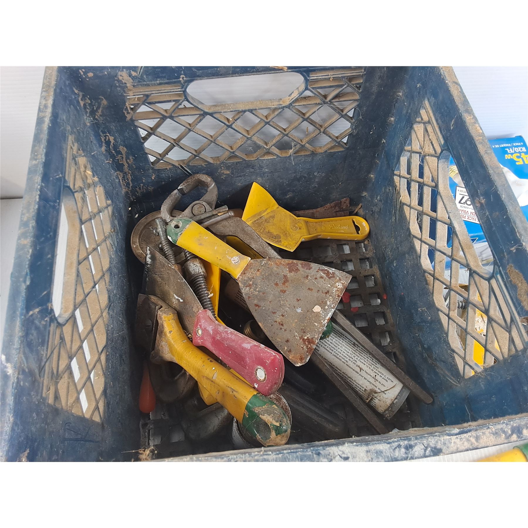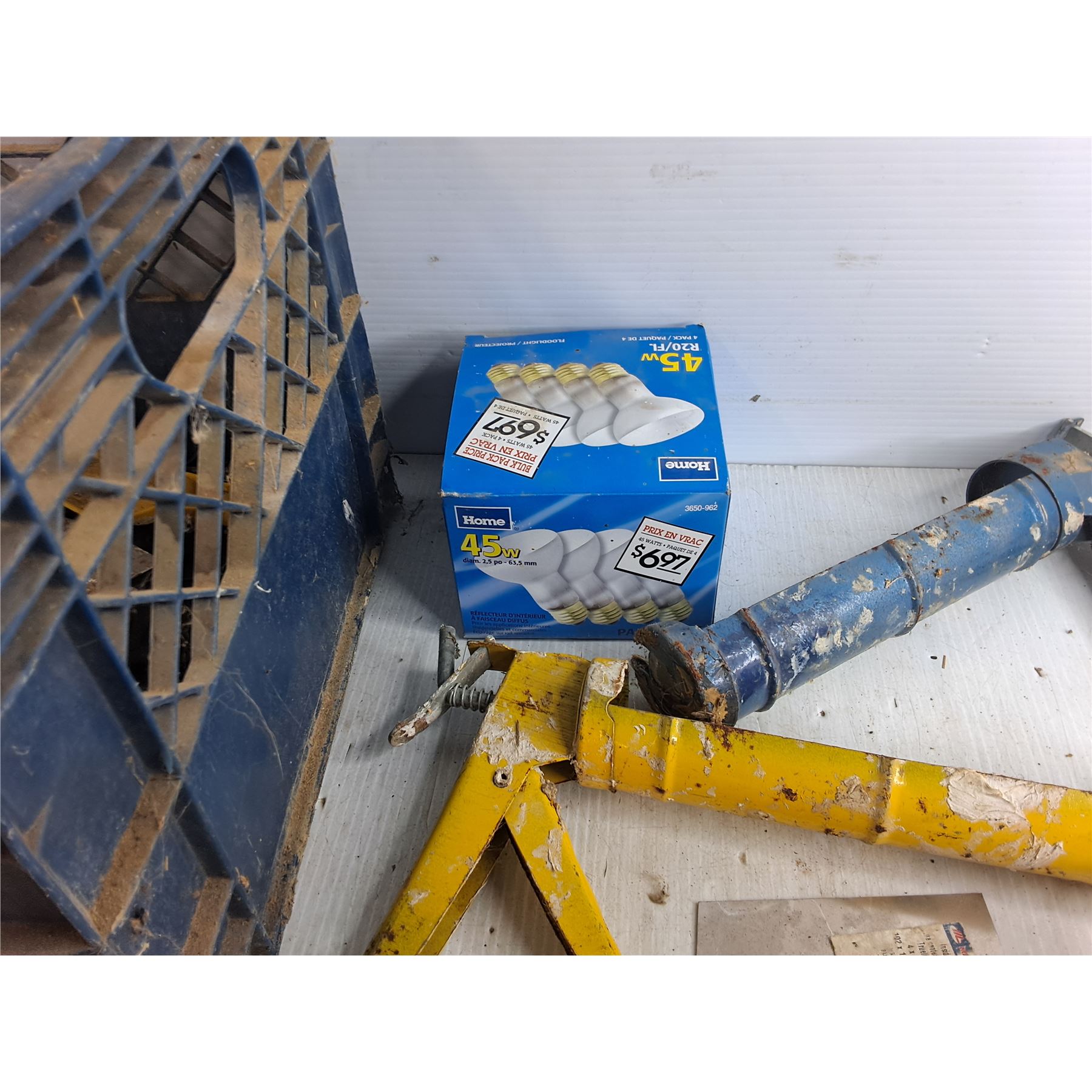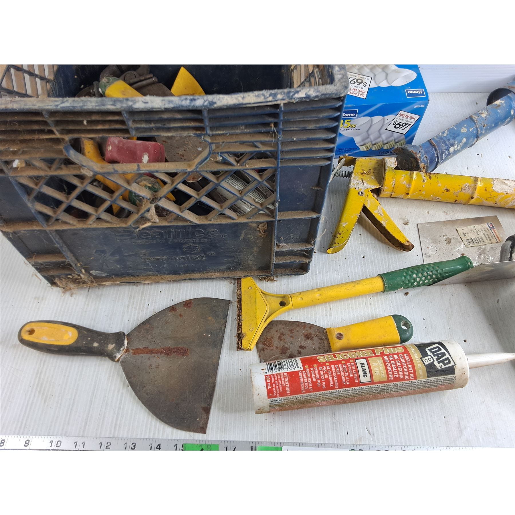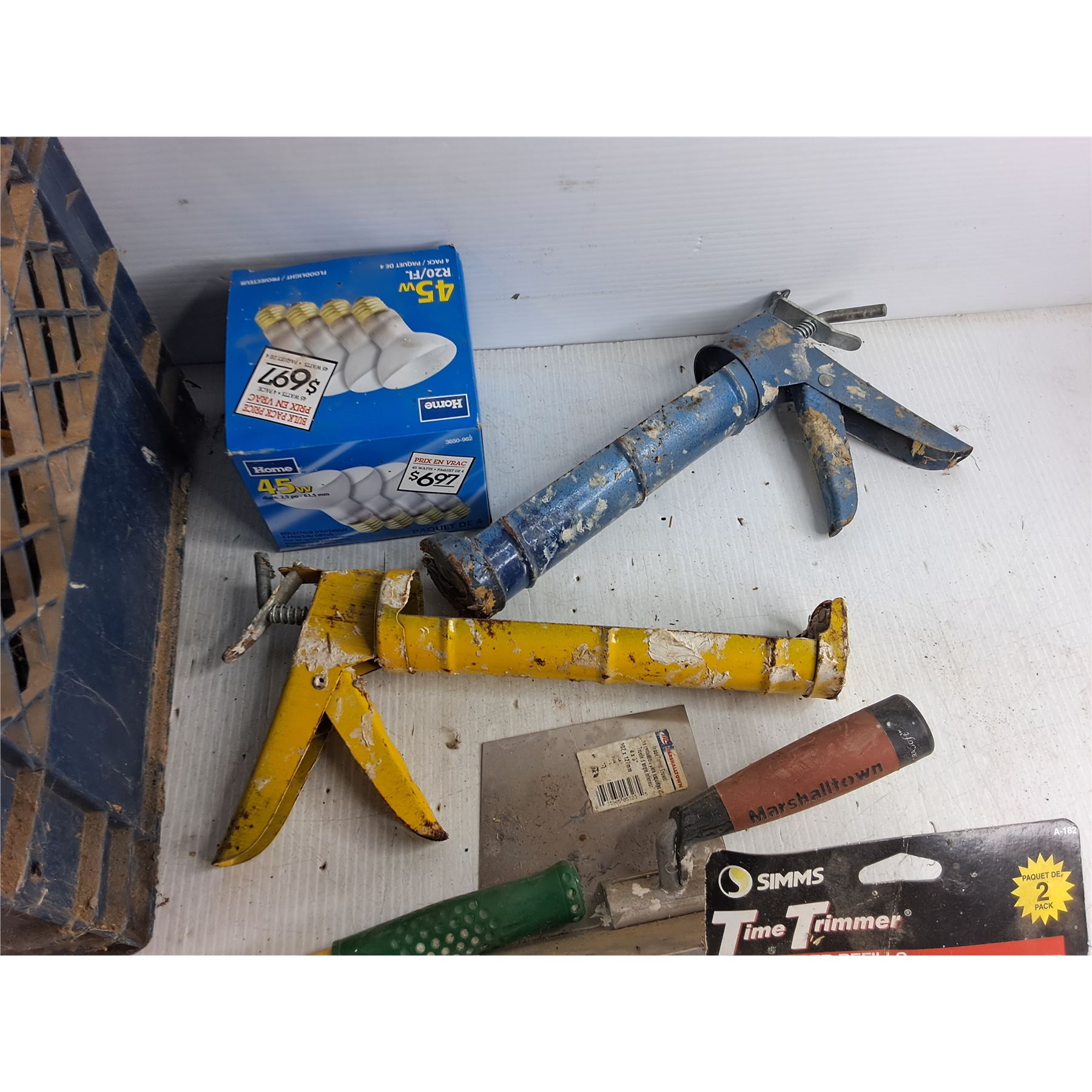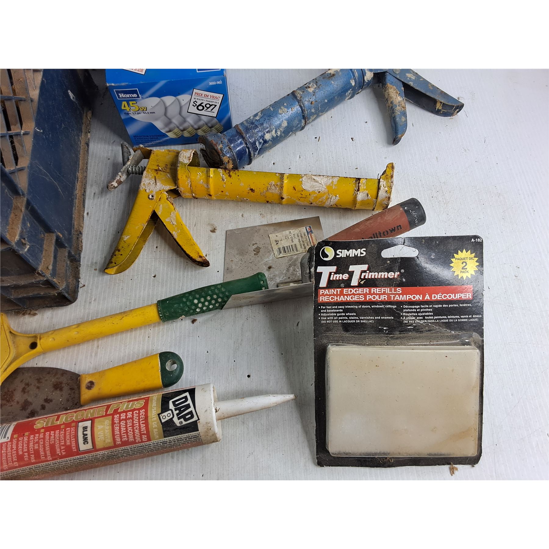 Dry Wall Tools, Caulking Guns, Silicone Sealant, Paint Edger Refills, 45W Light Bulbs, Milk Crate