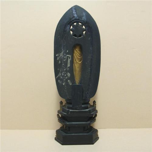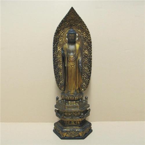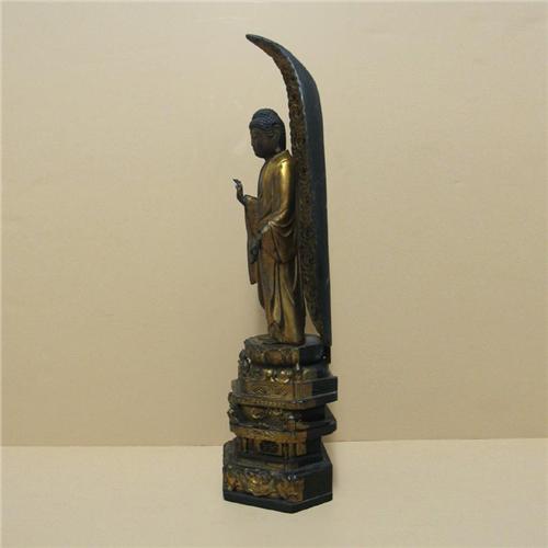 Dry lacquer gilt Japanese shrine of Amida Buddha, the Buddha of the Western Paradise; mounted on a lotus base with central wood peg; backed by a carved halo that extends to a point at top and curves over the figures head; 21" high; figure measures 10 1/8" high; first half of 19th C.; no visible defects