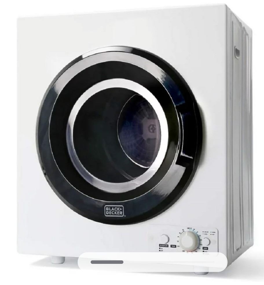 Black And Decker, 3.7 Cu Ft Vented Compact Dryer (23.6” x 21.5” x 27.5”) Ideal For Smaller Spaces, 49.5 lbs., Load Volume 13.2 lbs., No Hard Wiring, 120V Standard Outlet, Needs venting 4” Duct, Scratch & Dent, Left Side Lower Back Corner Small Dent, Left Side Lower Back Bottom Corner Corner Little Ripple, Dryer Runs Like Its Brand New